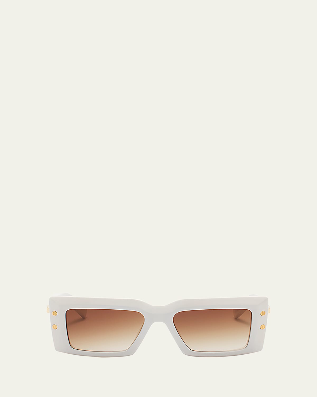 Balmain "Imperial" limited edition rectangle sunglasses in acetate and titanium Features Bmonogram accents on frames Lens/bridge/temple (in mm): 5317143 Gradient lenses Chain accent on hinges Engraved logo on temples Thin, tapered arms 100% UVA/UVB protection Made in Japan