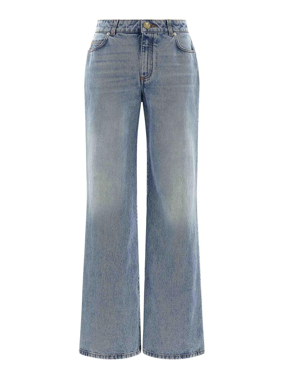 Jean en jean délavé surpiqué, fermeture éclair large et droite sur les jambes et bouton « testa di leone » sur les cinq poches, étiquette logo au dos
