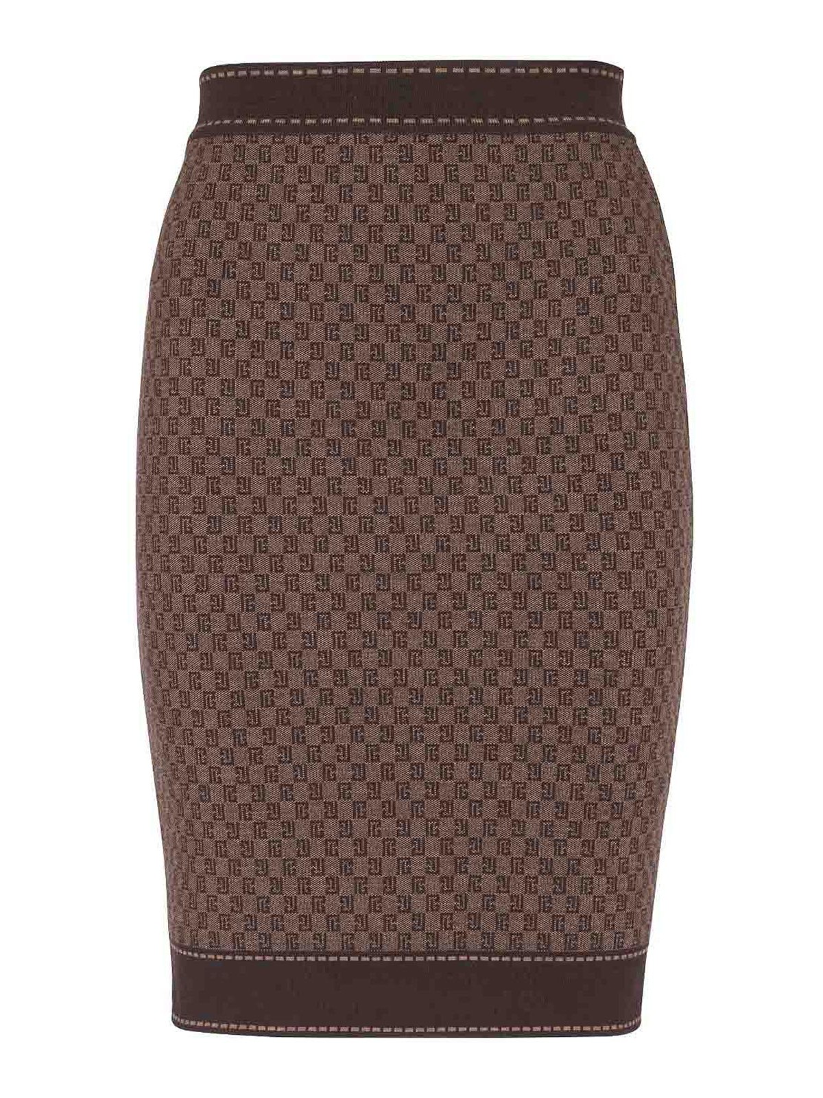 Jupe en jacquard monogrammé de Balmain, dotée d'une fermeture éclair arrière en jacquard monogrammé en mélange marron-beige et d'une longueur au-dessus du genou