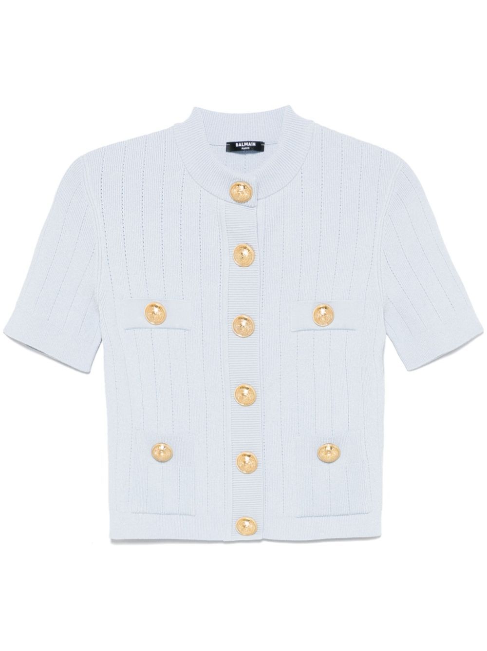 light blue front press-stud fastening logo-embossed buttons two front patch pockets short sleeves