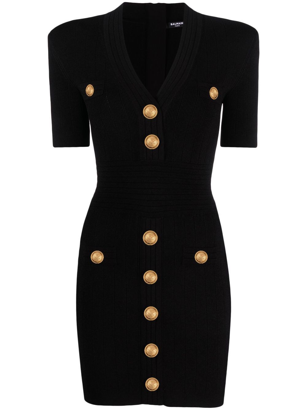 black knitted construction embossed gold-tone buttons ribbed panelling plunging V-neck shoulder pads short sleeves two front pouch pockets straight hem thigh-high