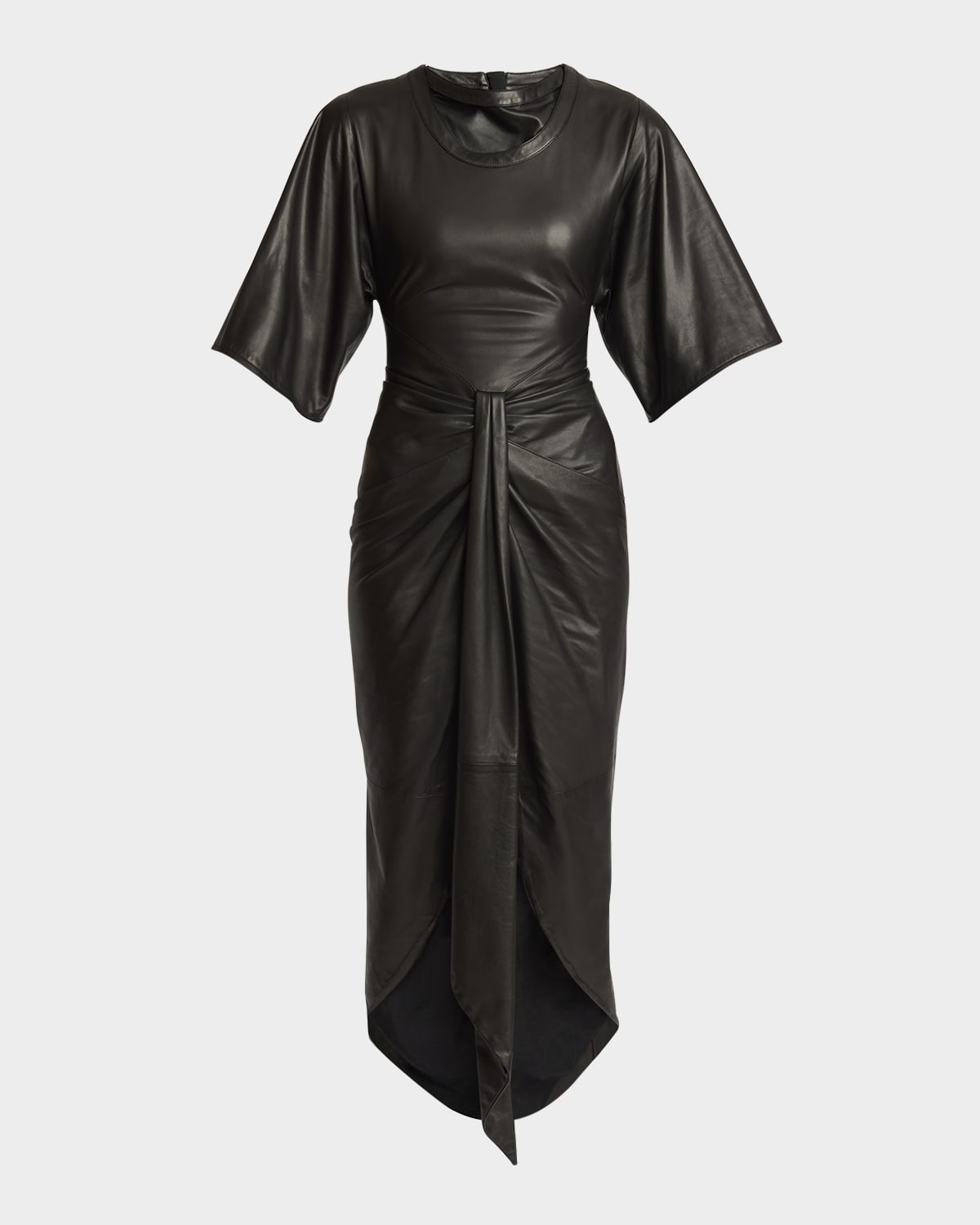 Balmain lambskin leather dress featuring a double collar and knotted draped waist detail Round neckline Short sleeves Sheath silhouette Hem falls below the knee Highlow hem Back zip Leather Made in Bulgaria