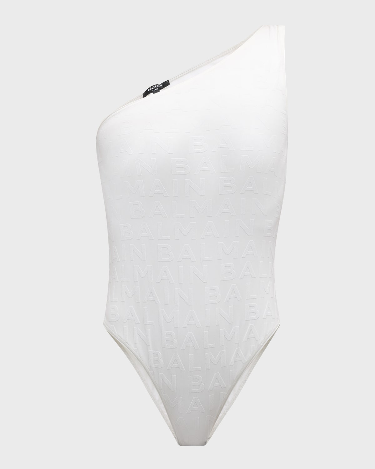 Balmain onepiece swimsuit featuring an allover logoembossed design Oneshoulder neckline Moderate seat coverage Nylon/polyamide/elastane Made in Italy
