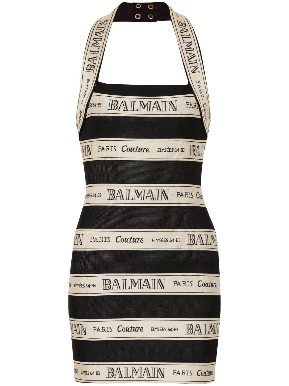 black/white canvas stretch-design jacquard logo motif rear zip fastening halterneck square neck sleeveless horizontal stripe pattern straight hem thigh-length