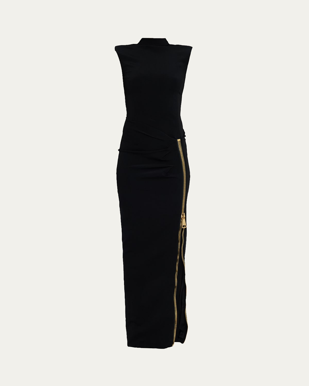 Exuding sultry architectural drama with precision tailoring, this Balmain dress is crafted in a sleek jersey, embracing the body in a sculpted silhouette with shoulder pads and a striking zipped front slit with an oversized engraved slider Mock neckline Sleeveless Bodyskimming silhouette Floor length Back zip Viscose/nylon/polyamide/elastane Professional cleaning recommended Made in Portugal