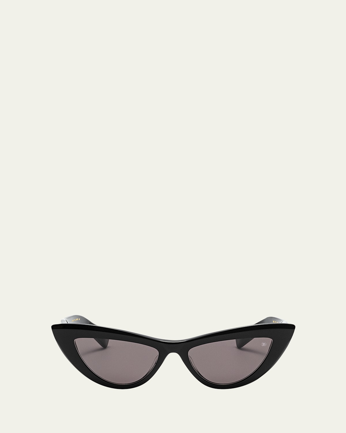 Balmain cateye sunglasses in lightweight titanium and acetate Lens/bridge/temple (in mm): 5418145 Solid lenses; monogram in corner Saddle nose bridge Monogram engraved hinges Thin, tapered arms 100% UVA/UVB protection Made in Japan