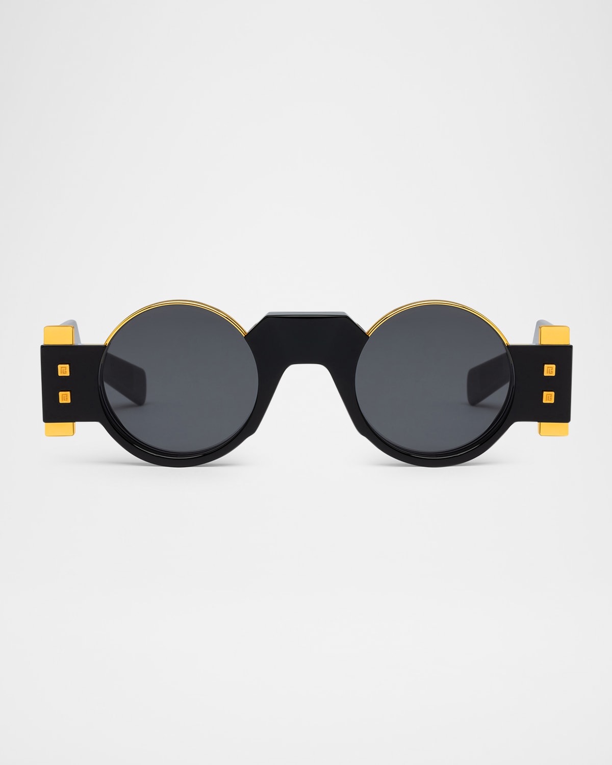 Balmain "OliverII" round sunglasses in acetate and titanium Eye/bridge/temple (in mm): 4324145 Solid lenses Saddle nose bridge Thick, tapered arms Gold logo accents at temples Acetate/titanium 100% UVA/UVB protection Made in Japan