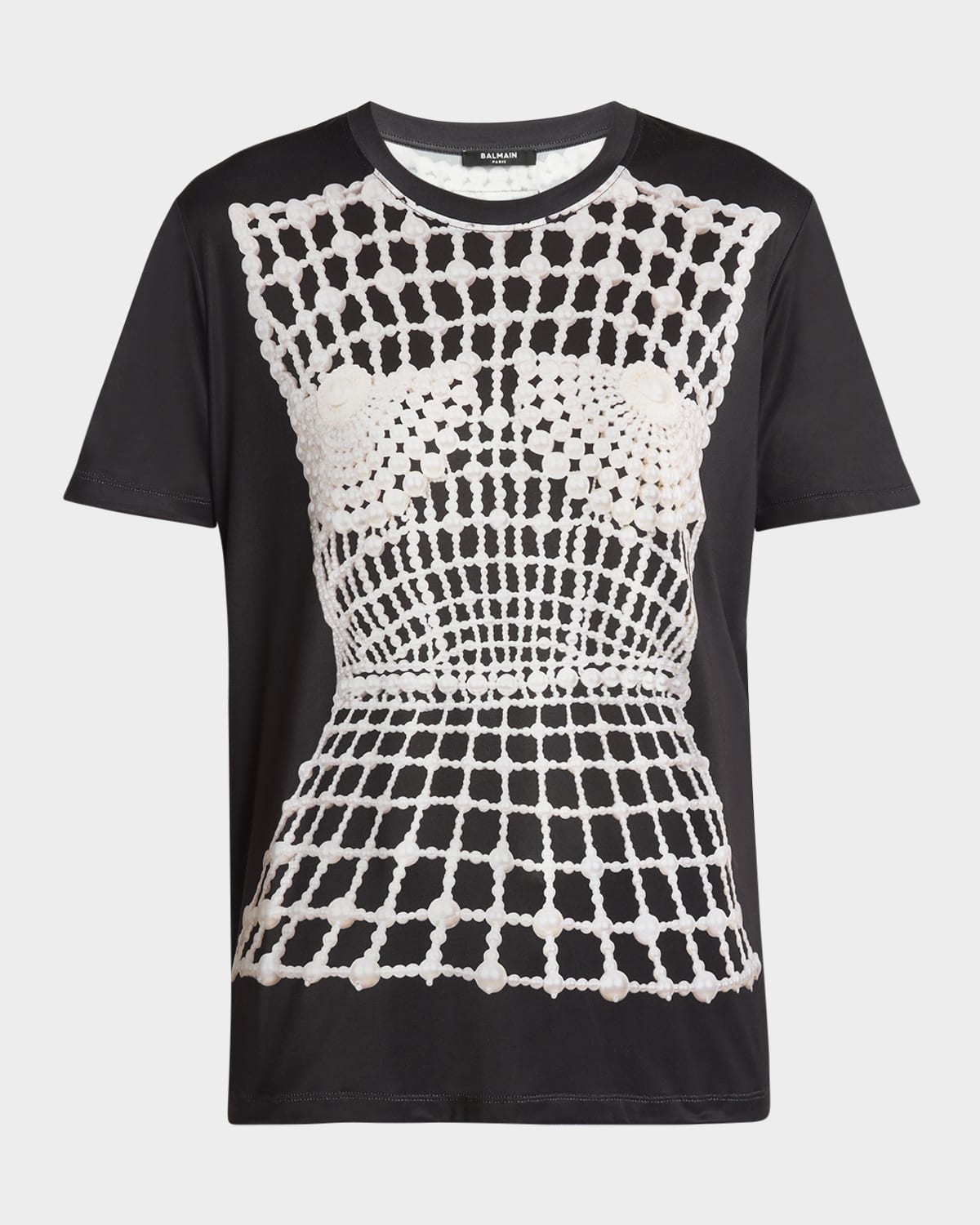 Balmain Tshirt features a pearl Trompe L'Oeil corset Crew neckline Short sleeves Relaxed fit Pullover style Polyester/elastane Professional cleaning recommended Made in Italy