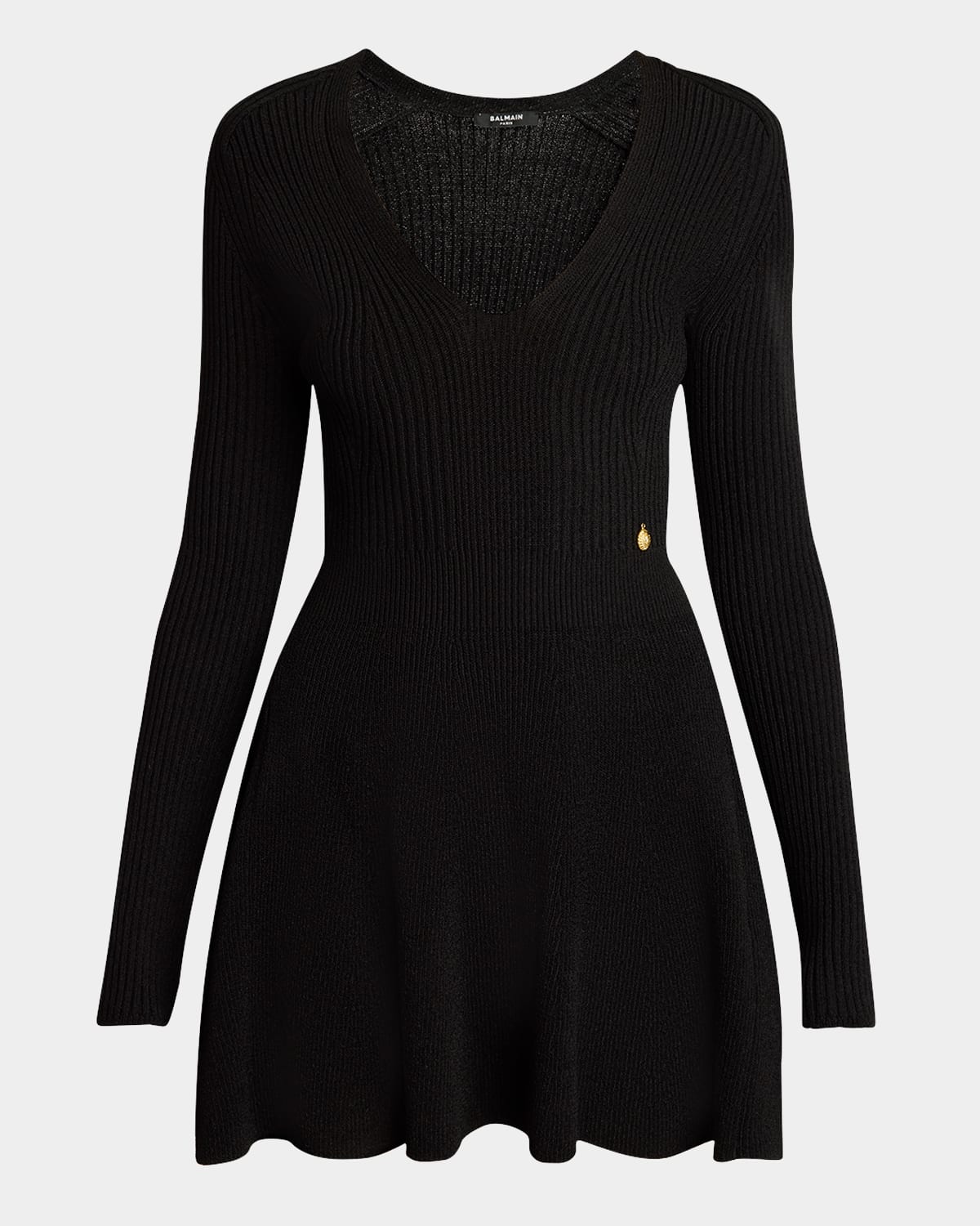 Plunging Long-Sleeve Rib Knit Mini Dress