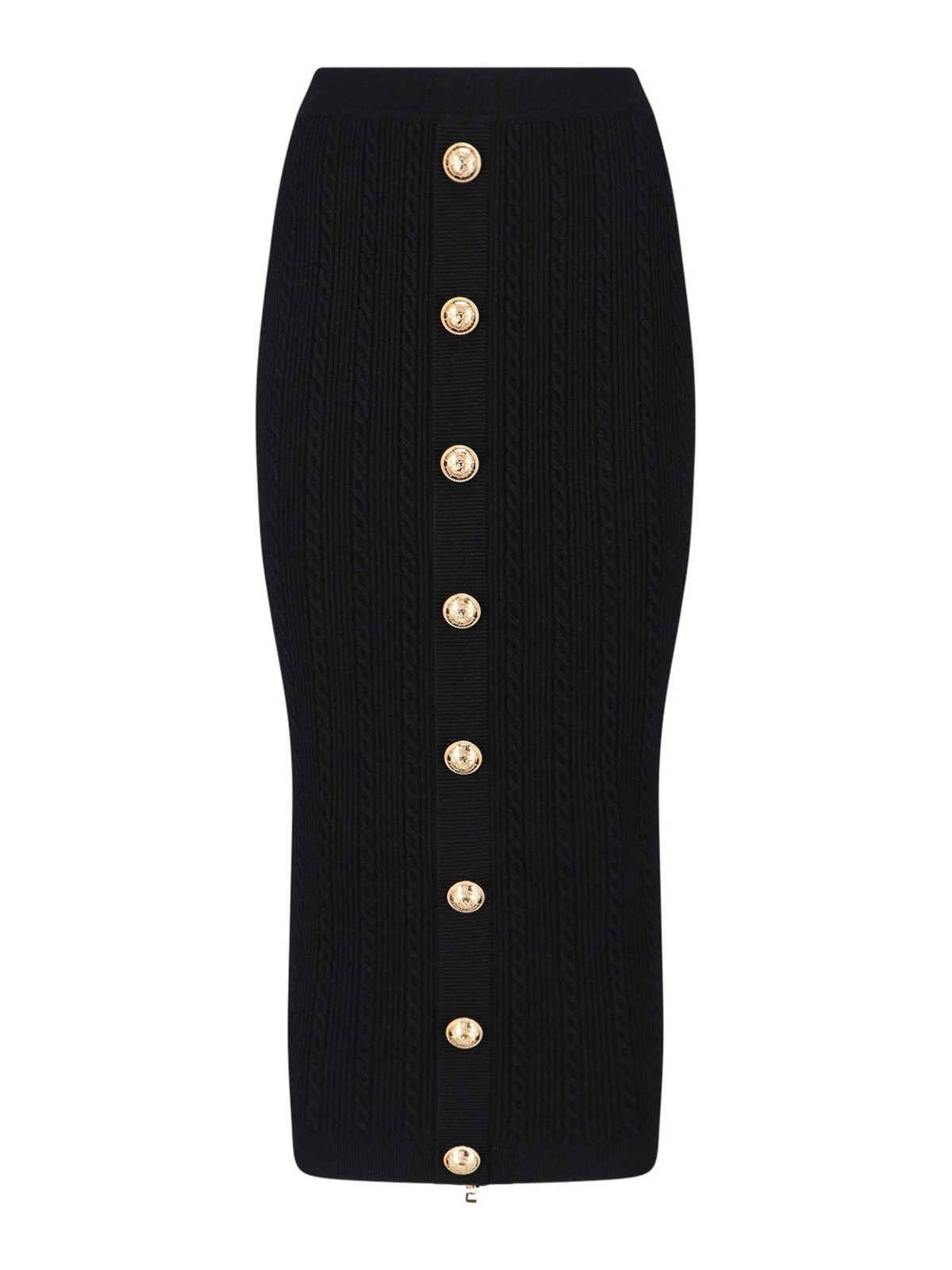 Jupe midi en chemise Balmain, en viscose noire mélangée, traitement côtier, taille moyenne élastiquée, fesses décoratives en métal doré, double fermeture zippée rétro, fente ajustable rétro, jambe droite.