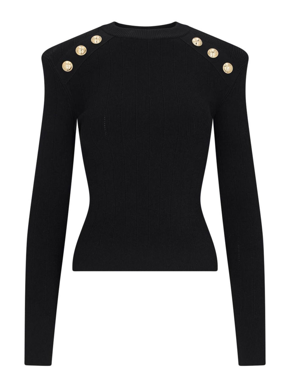 Pull à col rond Balmain en noir, métal doré, construction côtelée, épaules structurées ou six boutons appliqués, ourlet droit