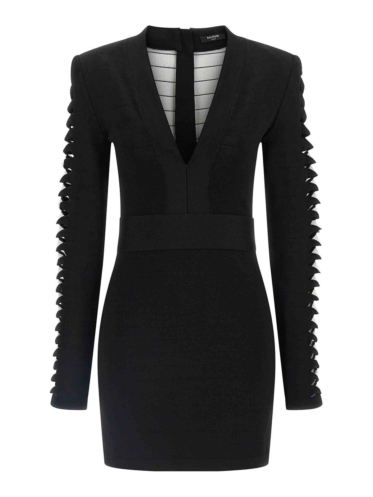 Mini-robe en mélange stretch avec coupe, décolleté et retournement, rehauts sur les manches, épaules rembourrées, V profond, encolure, fermeture éclair, manches longues non doublées