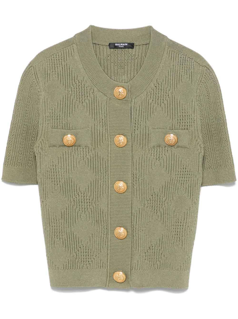 olive green knitted construction front press-stud fastening embossed gold-tone buttons crew neck short sleeves faux pocket detail ribbed cuffs and hem unlined