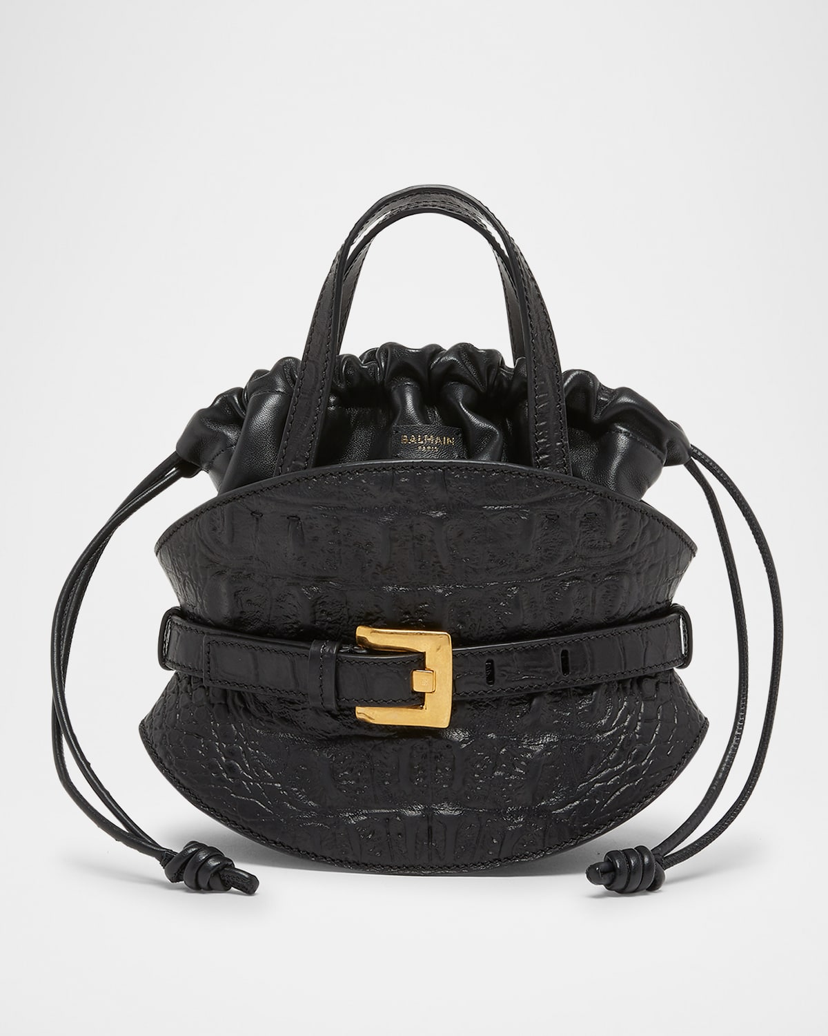The "Shuffle" tophandle bag from Balmain is crafted in soft leather and cinches with an exaggerated crocembossed belt Flat top handles Detachable crossbody strap Can be worn as a top handle or crossbody bag Drawstring closure Spot clean Approx. 5.7"H x 9.8"W x 3.9"D Made in Italy
