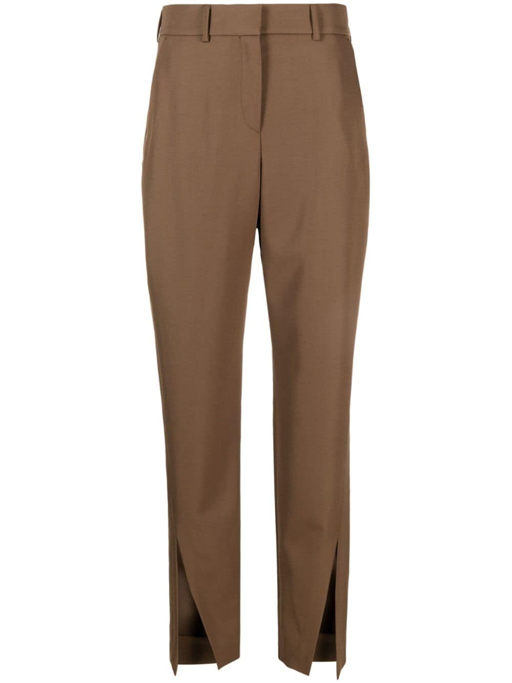 tobacco brown wool slit detailing tapered leg concealed front fastening two side inset pockets two rear jetted pockets