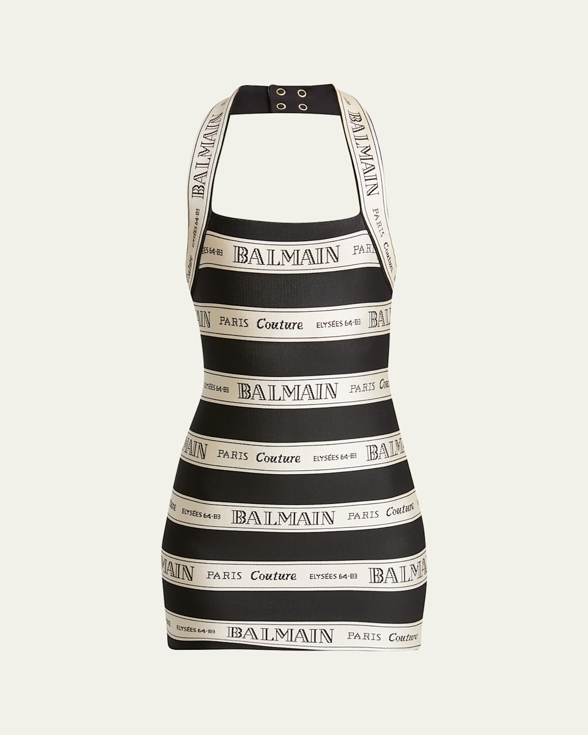 Balmain stripe dress with logo print Halter neckline; open back Sleeveless Mini length Bodyconscious silhouette Back zip Polyester Professional cleaning recommended Made in Portugal