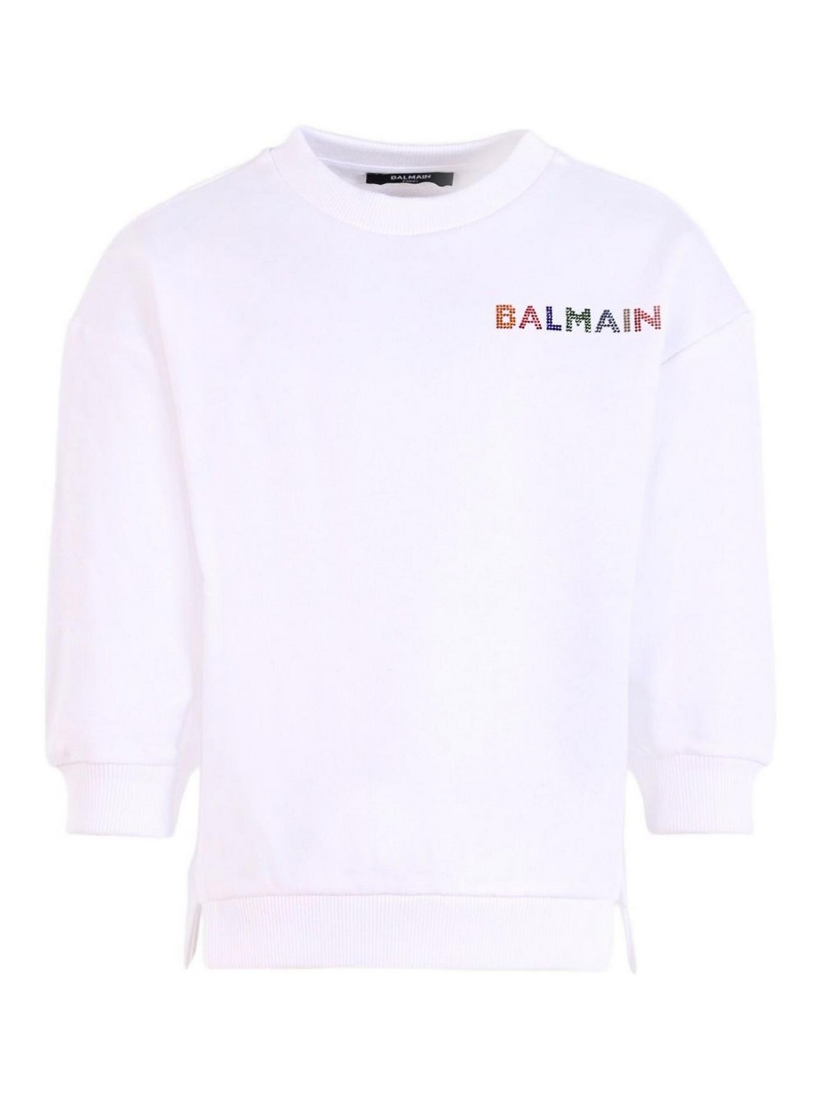 Le sweat-shirt pour fille de Balmain Kids conquiert avec son logo sur le devant orné de strass, confortable et lumineux, il est parfait pour ajouter un détail brillant aux looks de tous les jours, tout en conservant un style pratique et raffiné, Balmain Kids, sweat-shirt avec logo en strass, blanc, coton, logo avant avec strass, manches longues, coupe classique, col rond, bas et poignets côtelés