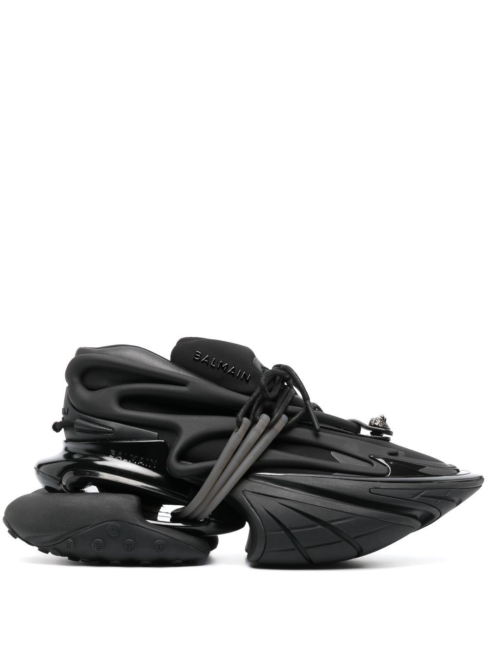 black goatskin layered design asymmetric design tonal design logo lettering debossed logo to the side embossed logo to the rear lion head motif branded insole almond toe front lace-up fastening chunky rubber sole