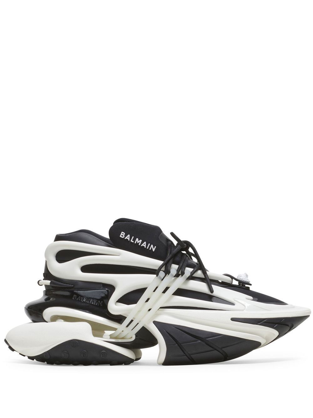 black/white panelled design pointed toe front lace-up fastening debossed logo to the rear segmented rubber sole