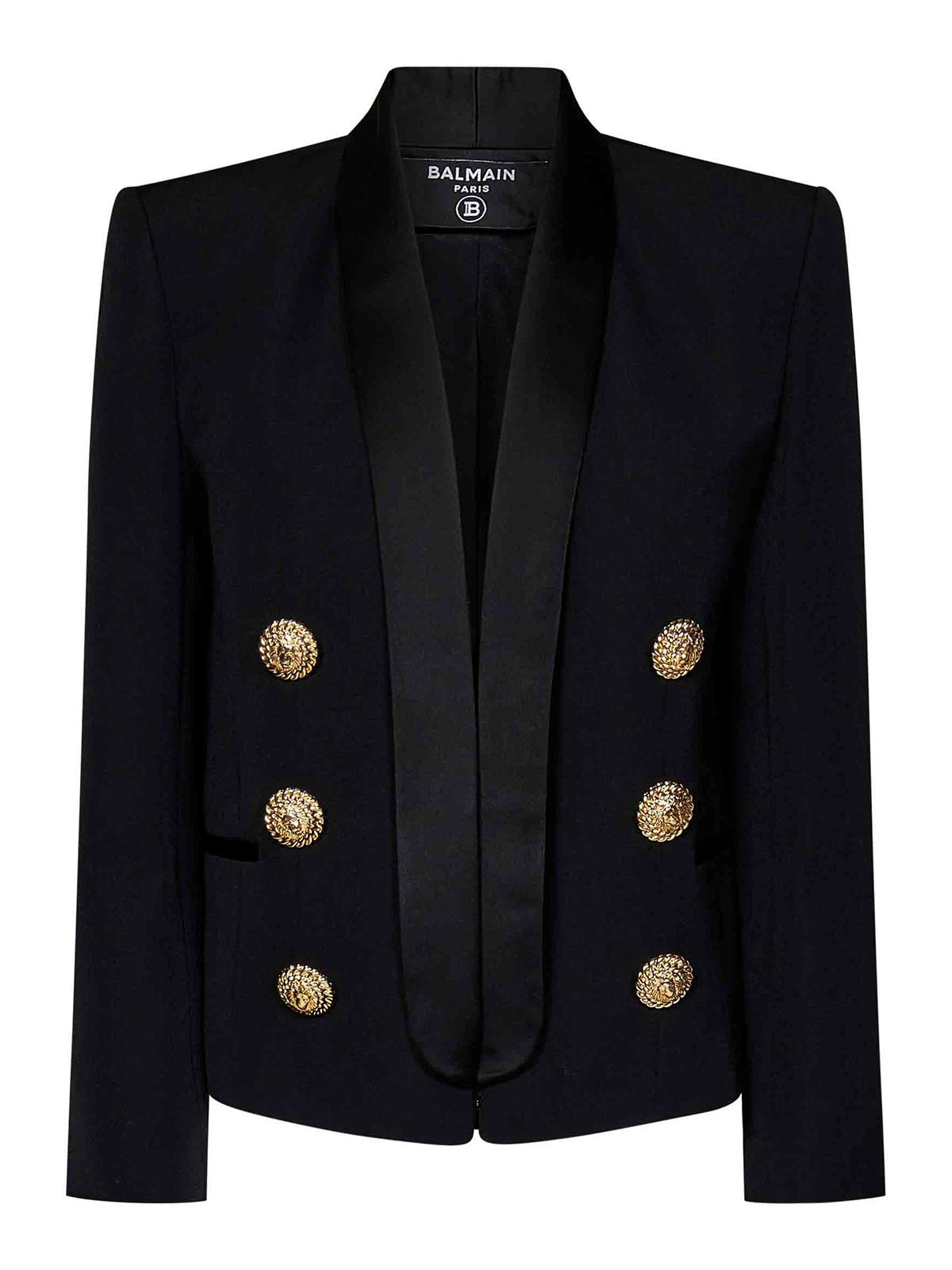 Crochet recouvert en bas, ton sur ton, col châle, manches longues, épaules structurées, cinq épaules structurées, poignets boutonnés, six boutons décoratifs dorés « lion à double chaîne » sur les poches passepoilées avec passepoil, serge, coupe courte, coupe ajustée, couleur noire ii