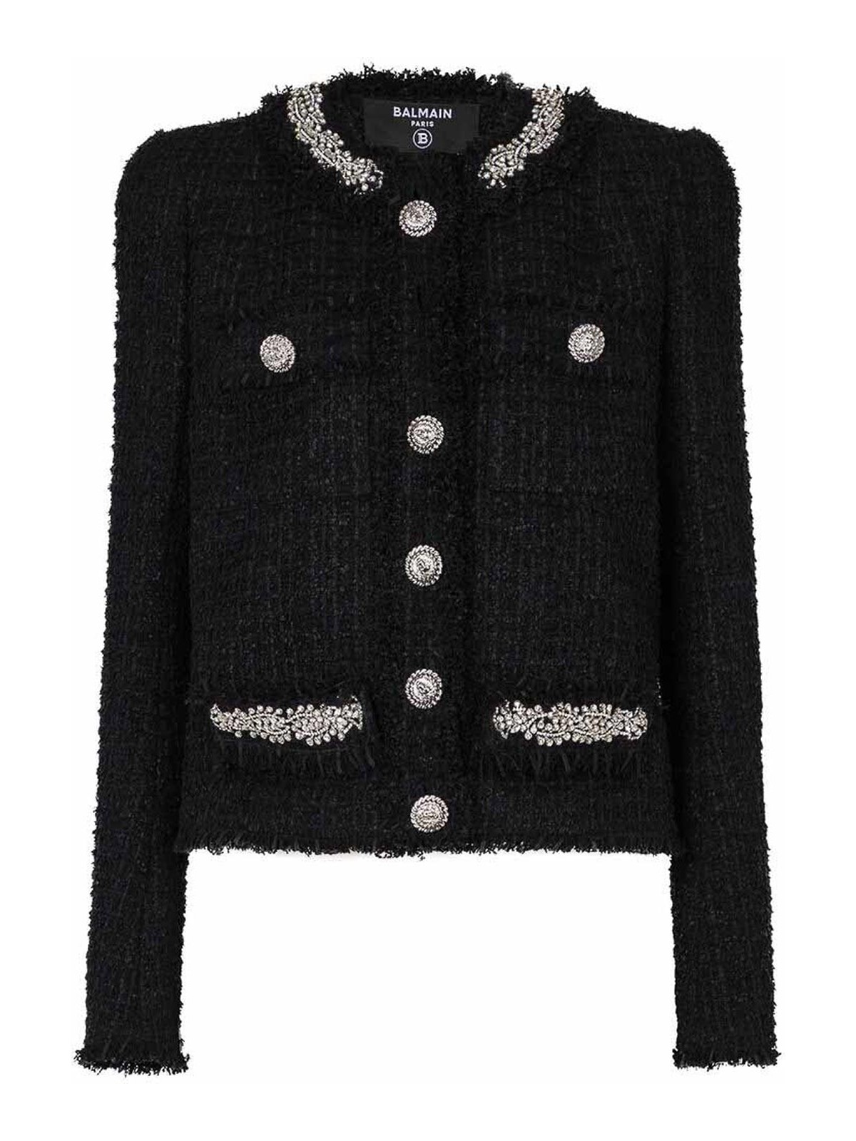 Motif brodé en tweed noir/blanc, col rond, col rond, ornement de perles, manches longues, fausse poche embossée, boutons ton sur ton, ourlet effiloché