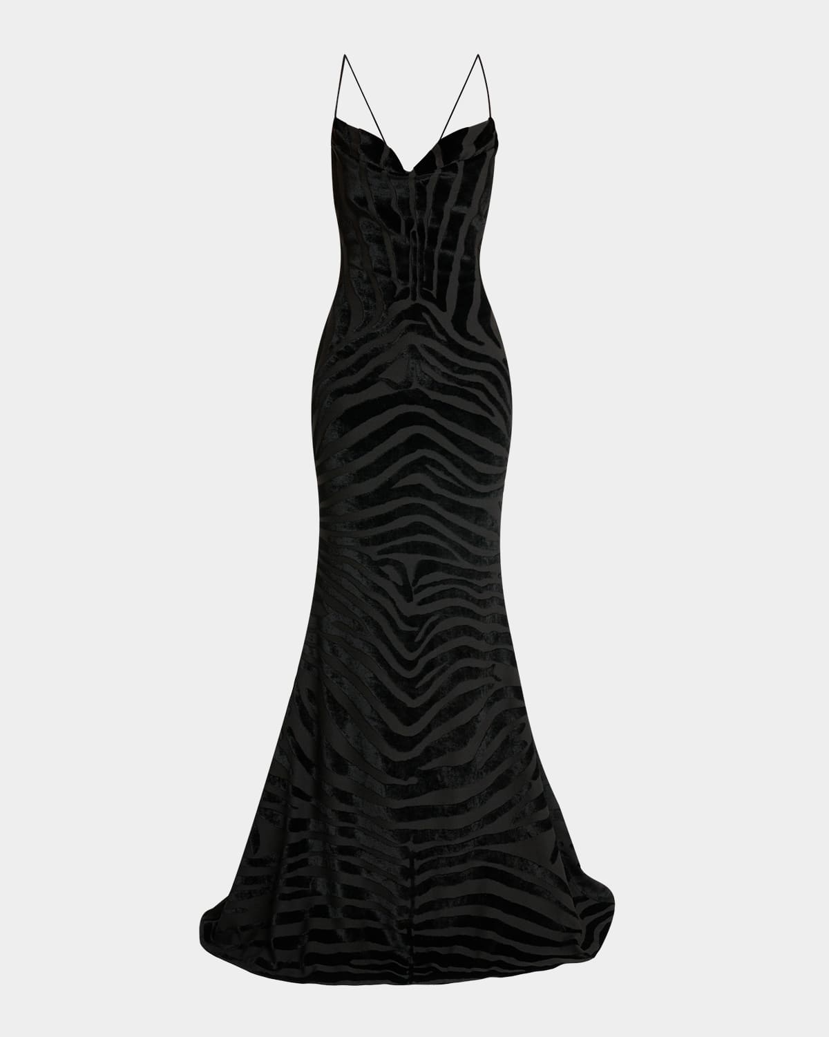 Crafted from plush velvet with a bold zebra stripe pattern, this Balmain gown features a formfitting silhouette that drapes elegantly to the floor, offering a commanding presence at any formal affair Cowl neckline Sleeveless Trumpet silhouette Floor sweeping hem Back zip Viscose/polyester Professional cleaning recommended Made in Bulgaria