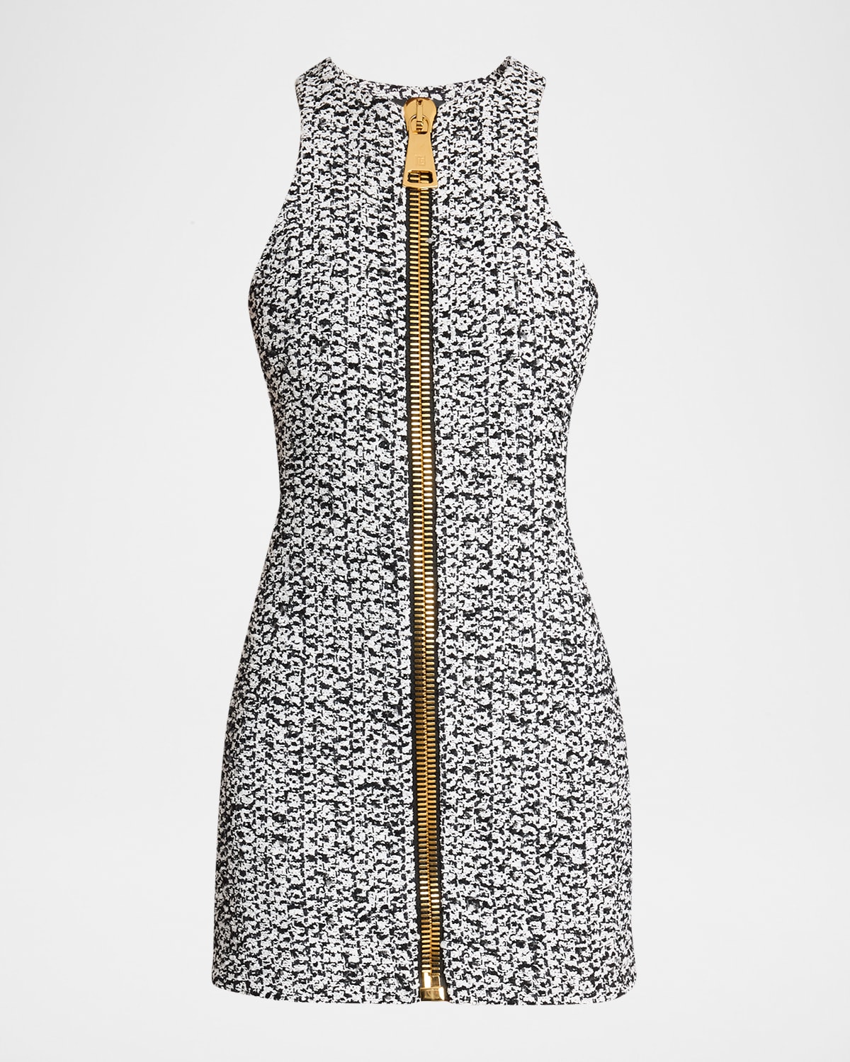 Crafted in twotone tweed, this Balmain mini dress is finished with chunky goldtone hardware for a signature touch. High neckline Sleeveless Figurehugging silhouette Hem falls above the knee Zipfront Viscose/cotton Professional cleaning recommended Imported