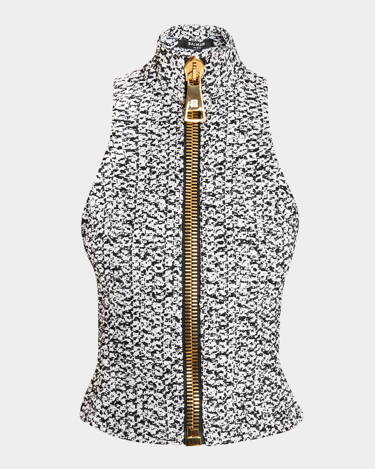 Crafted in twotone tweed, this Balmain vest is finished with chunky goldtone hardware for a signature touch. Stand collar; zipfront Sleeveless Fitted silhouette Hem sits at the hip Viscose/cotton Professional cleaning recommended Imported