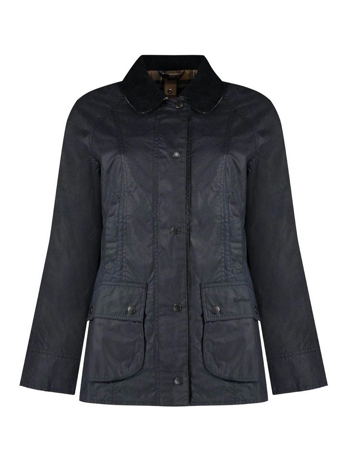Devant bleu foncé avec boutons, deux poches frontales, col classique, manches longues, fente arrière