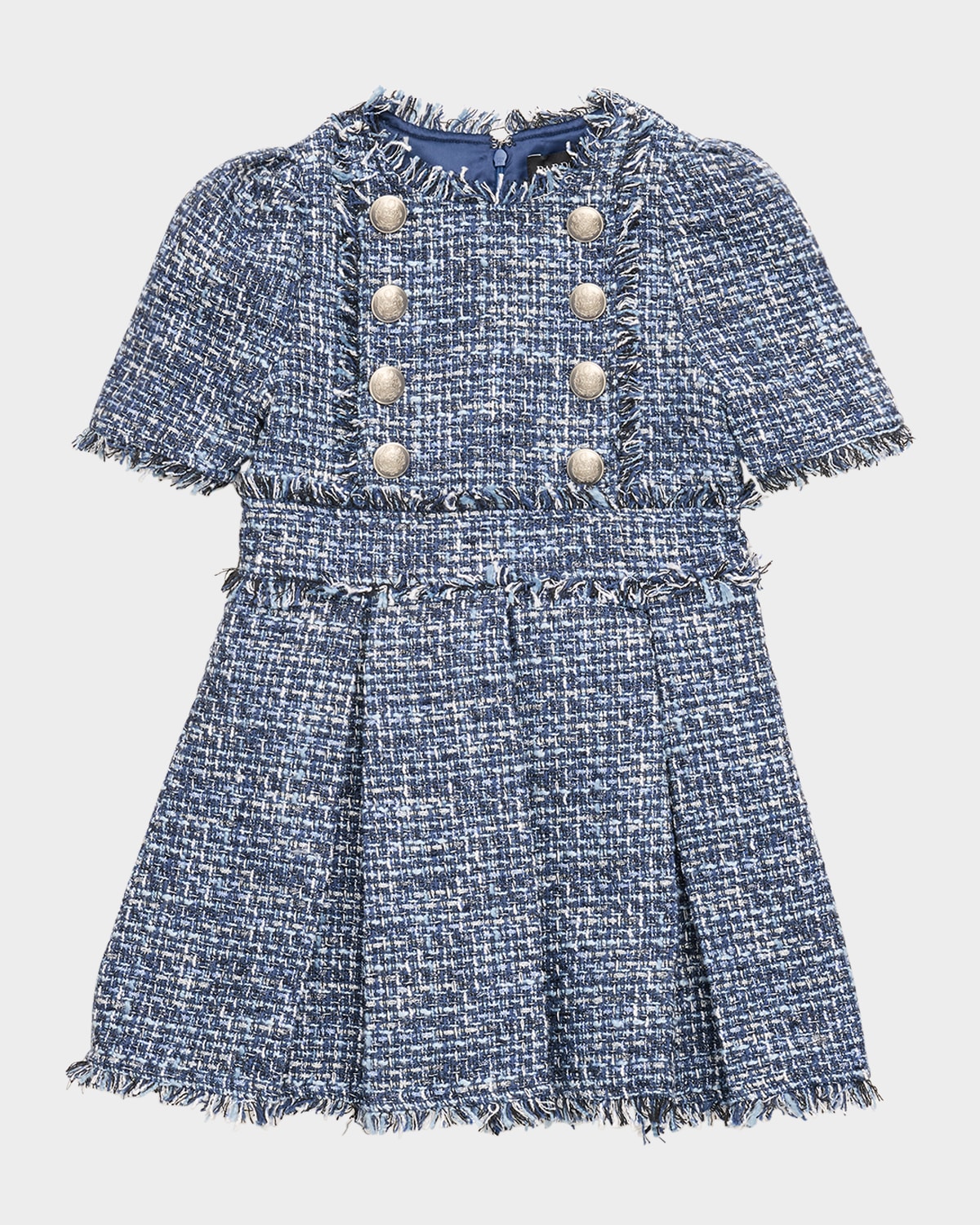 Crafted from boucle woven with metallic fibers, the Bardot Junior "Elle" shift dress features frayed details and goldtone buttons for a contemporary meets classic look Round neckline Short puff sleeves Front vertical yoke Wide waistband Hem falls above the knee Fit amp; flare silhouette Invisible back zip closure Polyester/metallic fibers Lining: Polyester Hand wash Imported