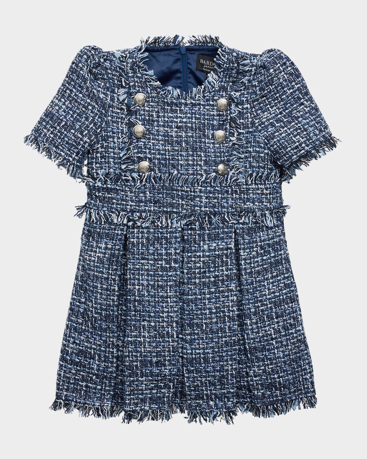Crafted from boucle woven with metallic fibers, the Bardot Junior "Elle" shift dress features frayed details and goldtone buttons for a contemporary meets classic look Round neckline Short puff sleeves Front vertical yoke Wide waistband Hem falls above the knee Fit amp; flare silhouette Invisible back zip closure Polyester/metallic fibers Lining: Polyester Hand wash Imported