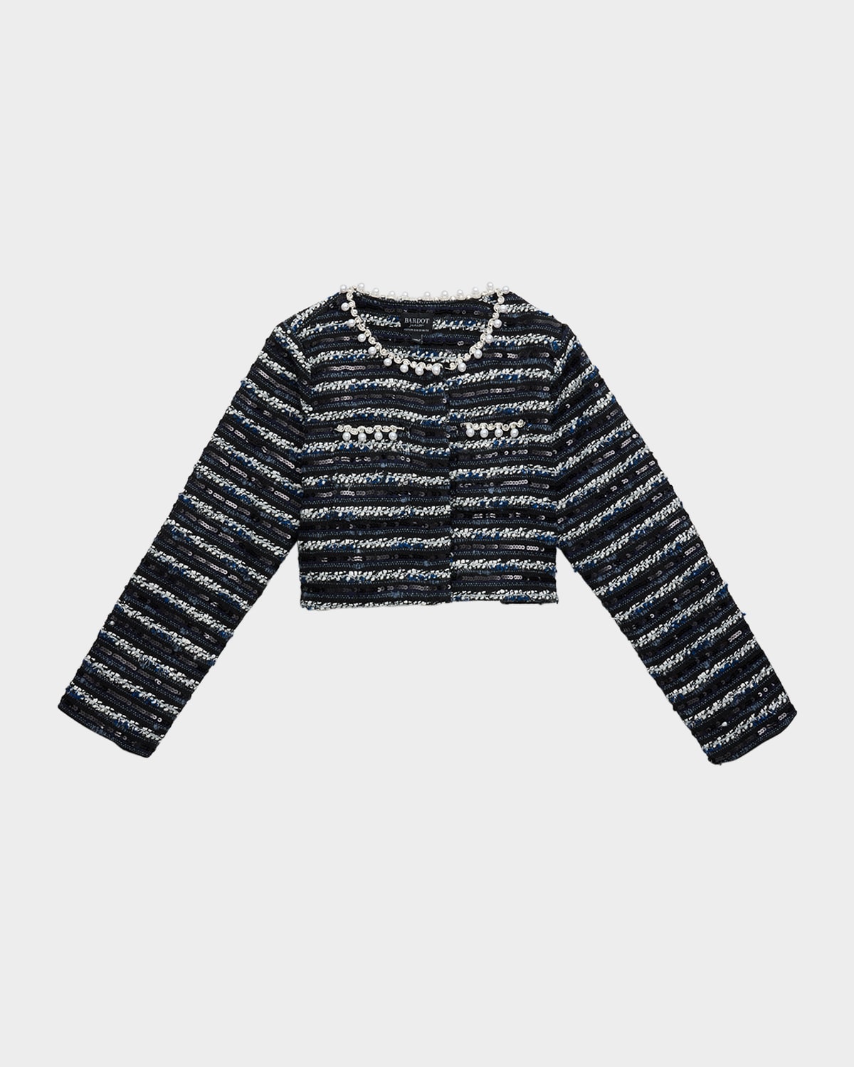 Bardot Junior "Lana" elegant jacket crafted in a tactile boucle fabric with diamante trims Crew neckline Long sleeves Two patch pockets Cropped length Concealed button front Polyester/elastane/polyethylene terephthalate (PET) Imported