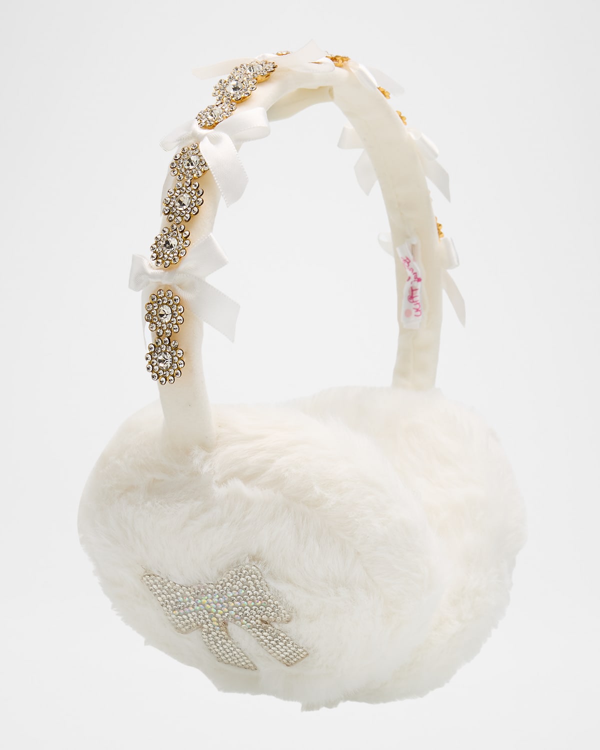 Bari Lynn soft faux fur (polyester) earmuffs, prettily adorned with crystal accents and satin bows Crystalstudded bow motif on the sides One size fits most Lining: Polyester Spot clean Imported