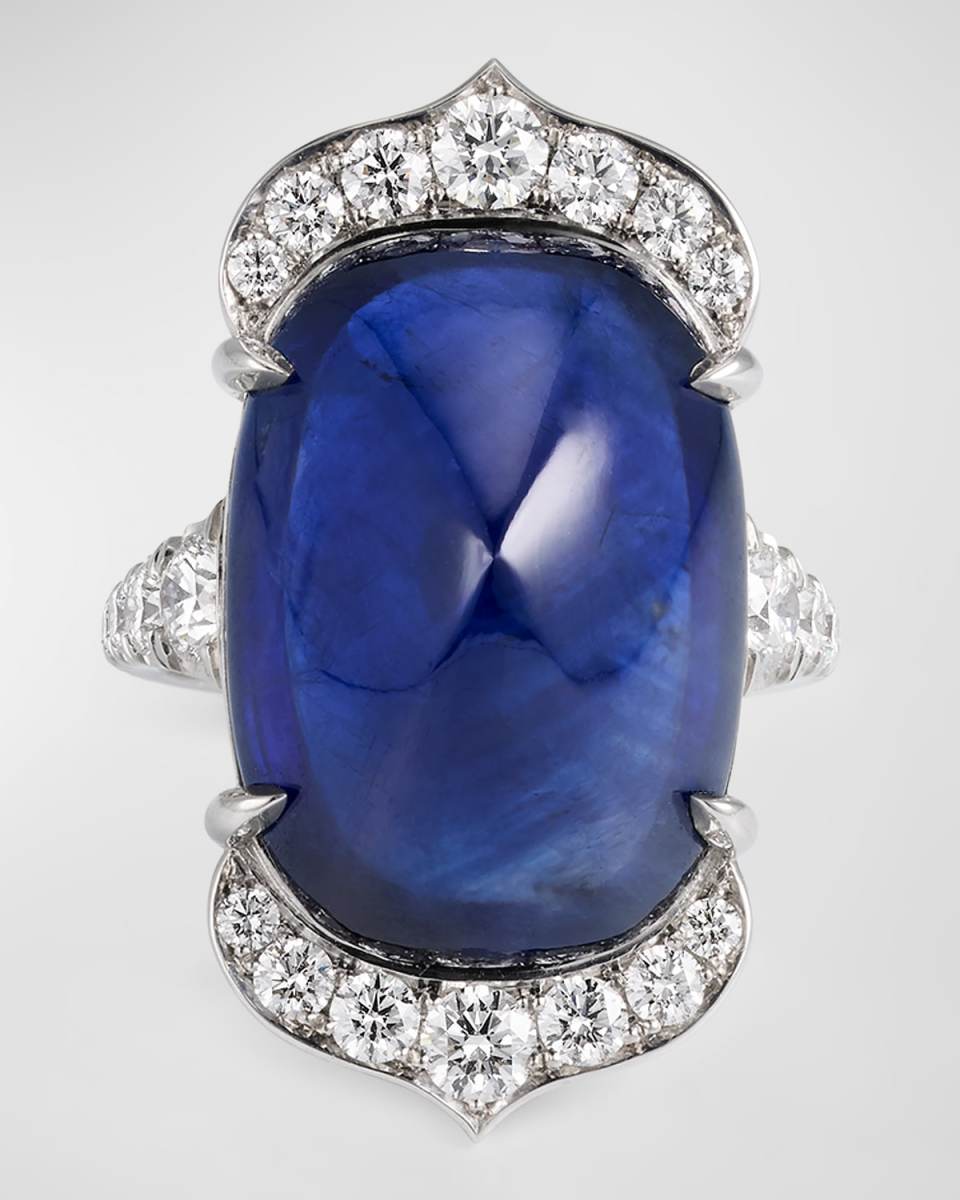 Bayco ring Platinum setting Sugarloaf cabochon ceylon sapphire Intricate colorless diamond micropavé with a graduated shank diamond micropavé 22.11 total sapphire carat weight 1.32 total diamond carat weight Made in USA