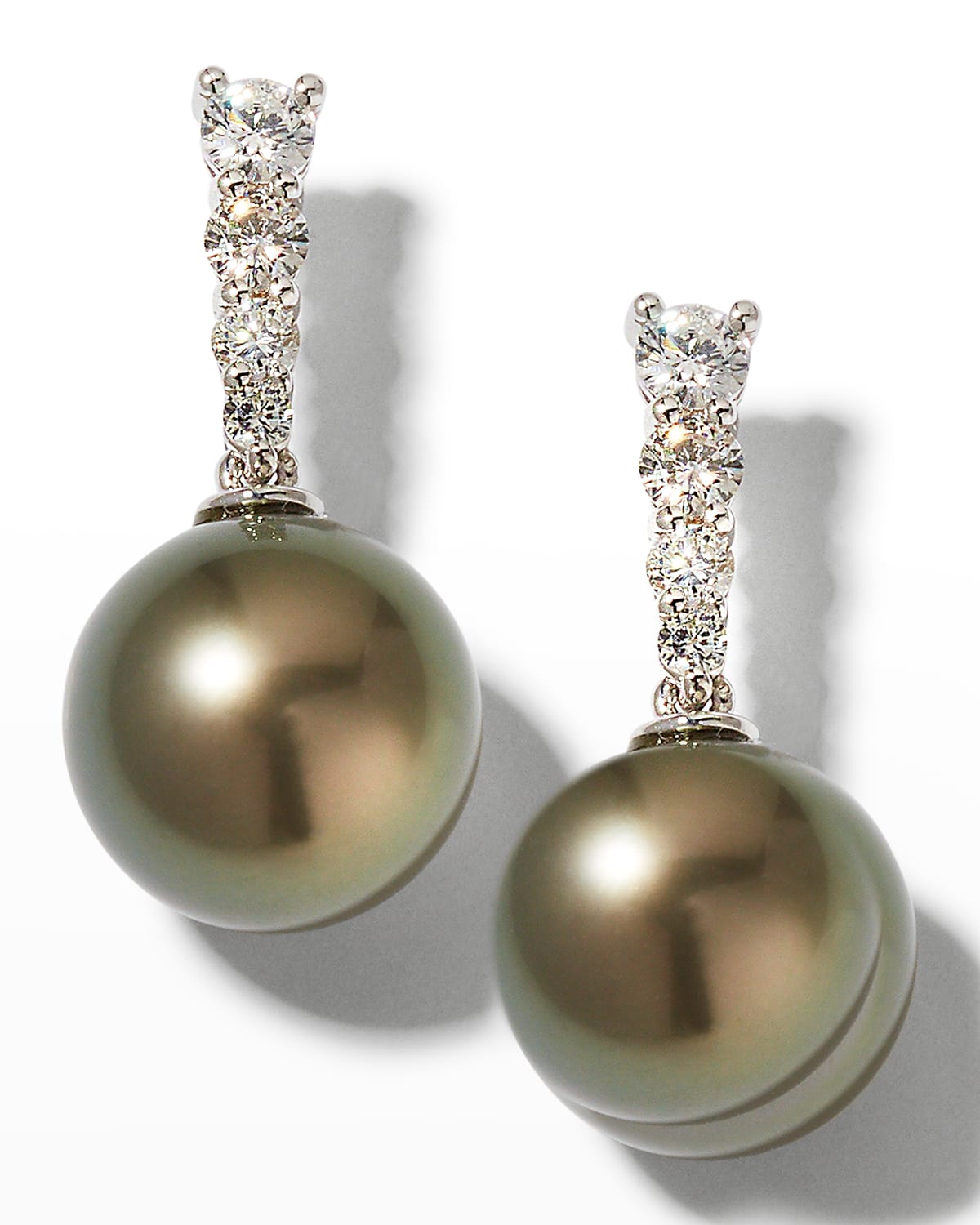 Belpearl Tahitian pearl drop earrings. Polished 18karat white gold settings. Graduating white diamonds at posts. Naturally gray Tahitian cultured pearls. Pearl dimensions: approx. 10.5mm. 0.54 total diamond carat weight. Post backs for pierced ears.