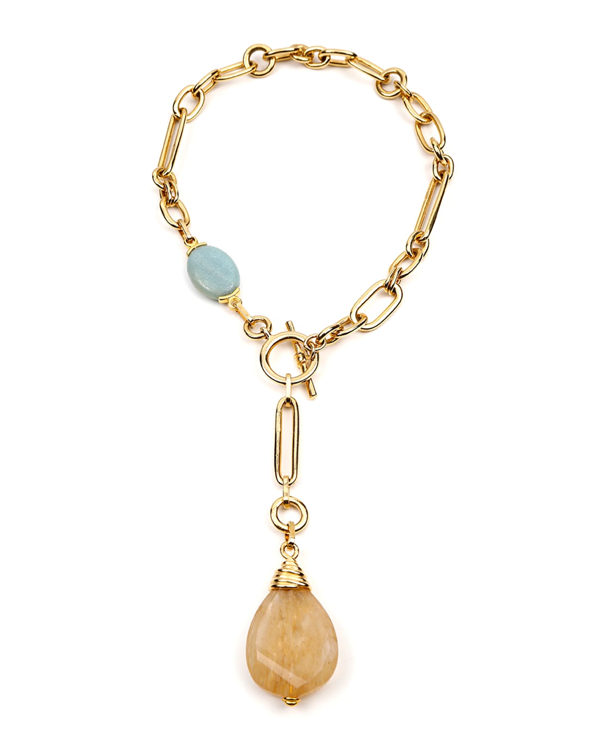BenAmun necklace features chunky mixedshape chain links. 24karat goldplated pewter. Blue and ochre dyed glass stones. Approx. 20"L. Made in USA of imported material.