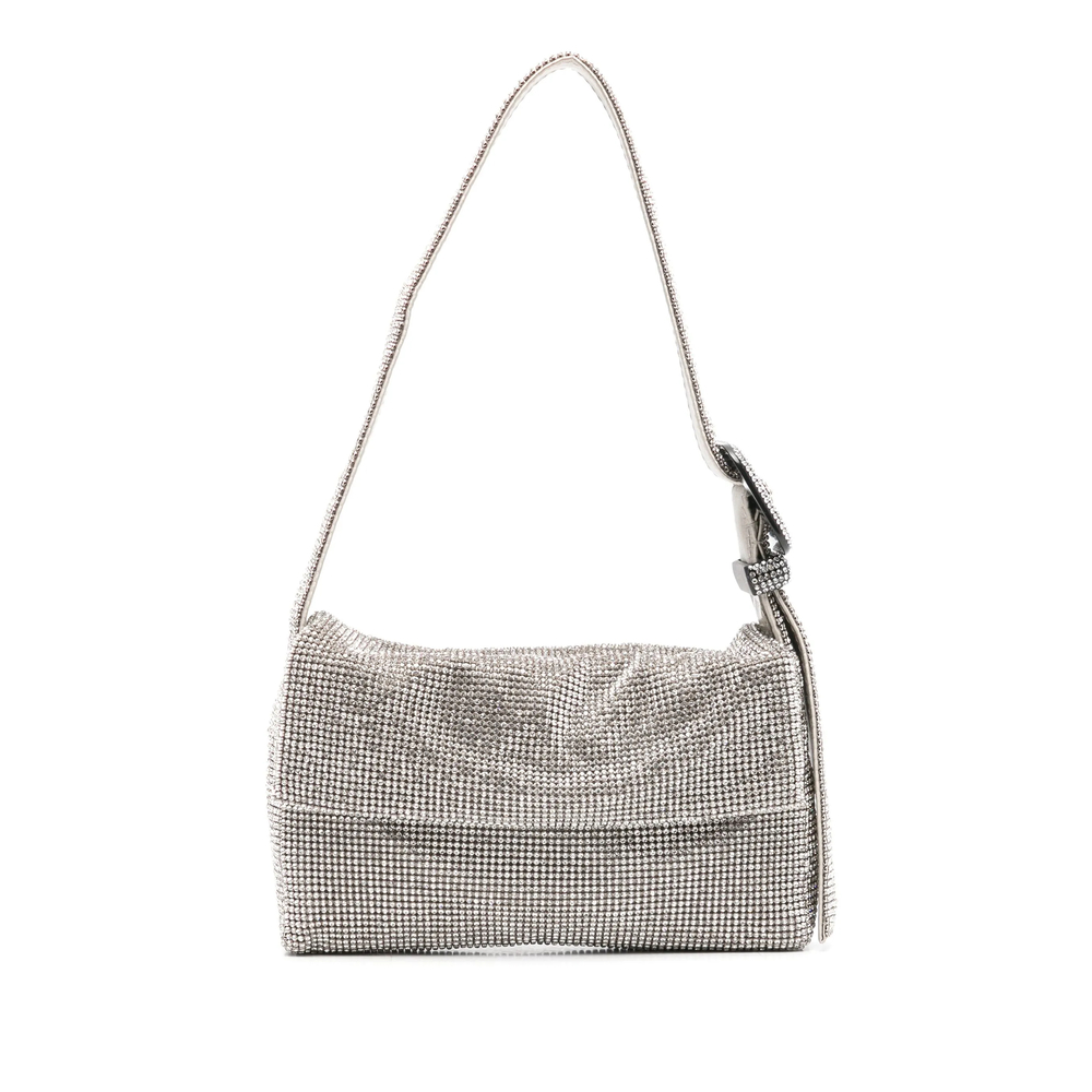 silver-tone silk satin crystal embellishment adjustable shoulder strap foldover top internal logo patch concealed top-zip fastening