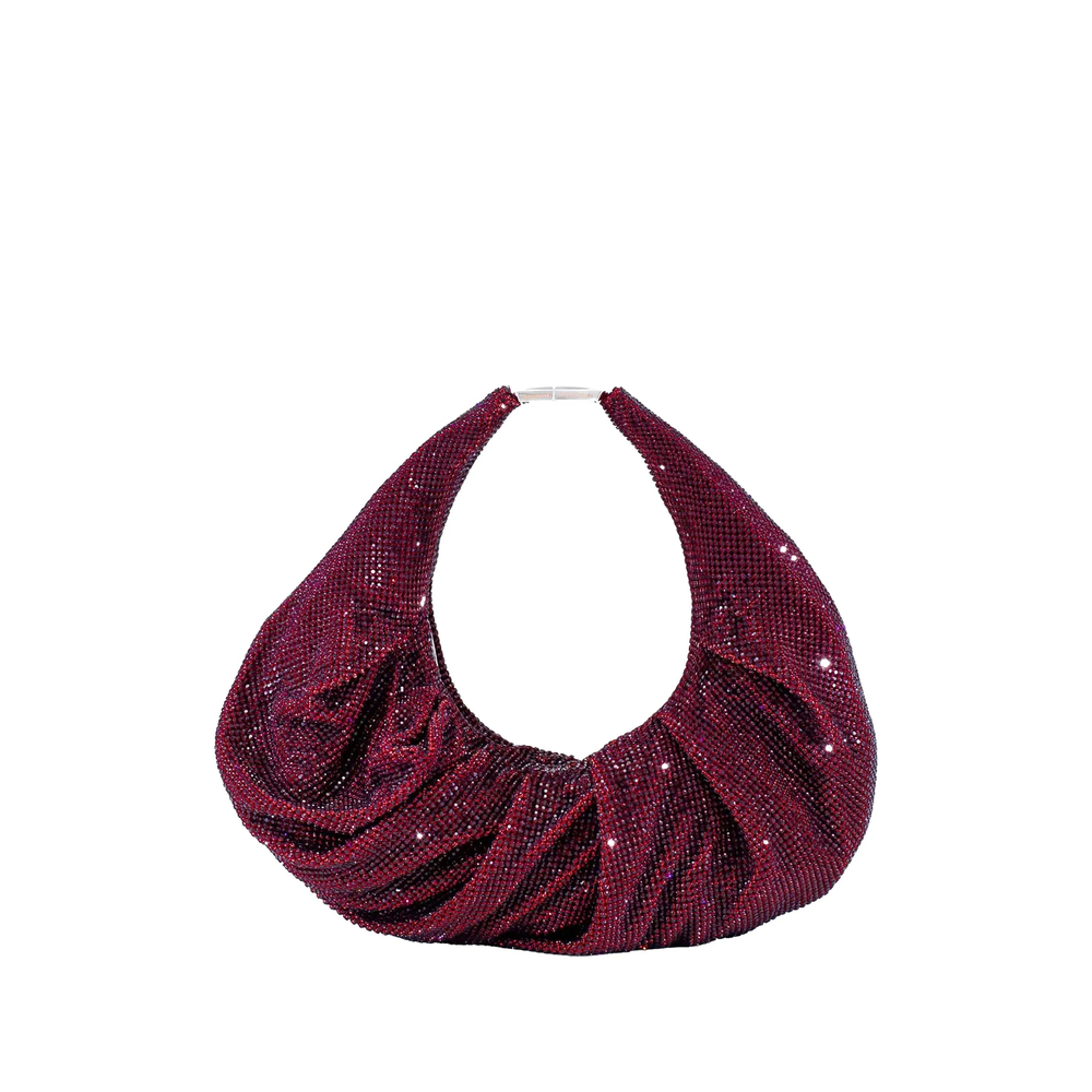 purple crystal embellishment draped design top handle zip fastening curved silhouette