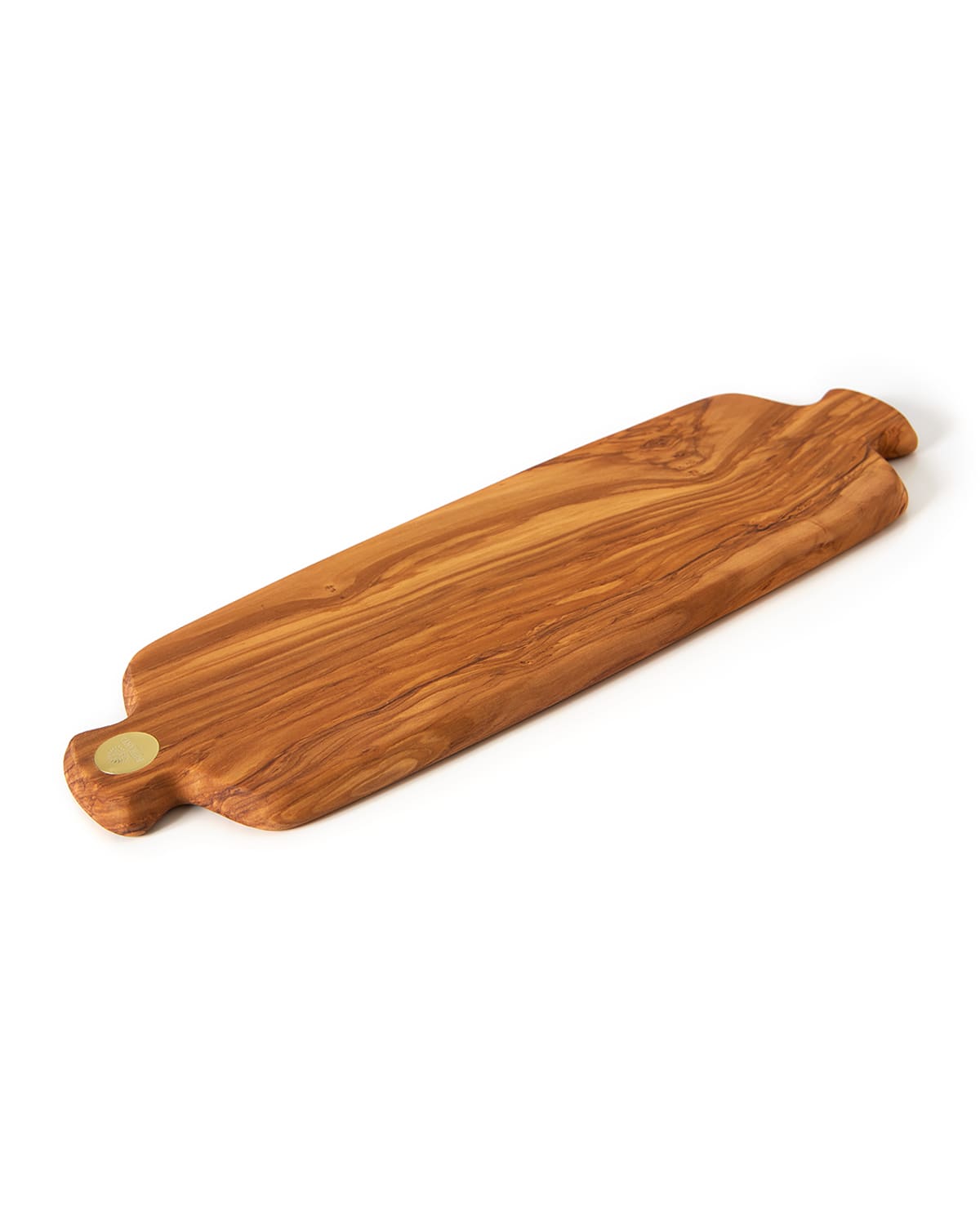 Handcrafted cutting board made of olive wood. Never immerse in water and avoid exposure to extreme temperature to prevent cracks. Occasionally apply food safe mineral oil or beeswax to keep wood looking its best. Approx. 15.5"L x 0.7"T x 11.3"W. Made in France.