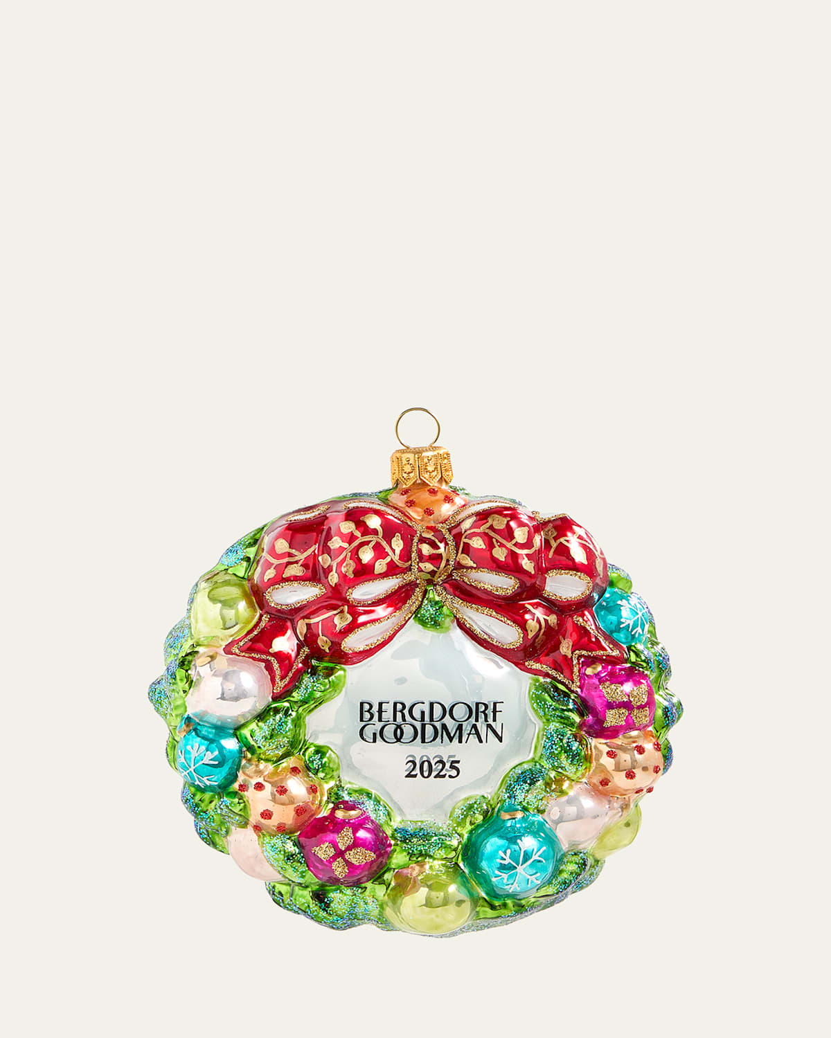 This handcrafted ornament resembles a Christmas wreath with multihued ornaments. The center of the wreath is highlighted with the iconic "Bergdorf Goodman" logo, followed by "2025". Handcrafted of glass Approx. 4.53"L x 2.0"W x 4.7"H Item Weight (Lbs.): 0.1 Handle with care Wipe clean Made in Poland