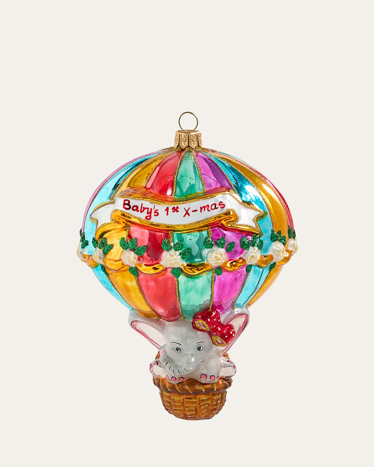 This ornament resembles a hot air balloon trimmed with glitter. The multicolor balloon is finished with "Baby's 1st Xmas" text. Cherish your baby's first Christmas and hang this handcrafted ornament from your Christmas tree this year. Handcrafted of glass Approx. 3.94"L x 3.9"W x 5.7"H Item Weight (Lbs.): 0.1 Handle with care Wipe clean Made in Poland