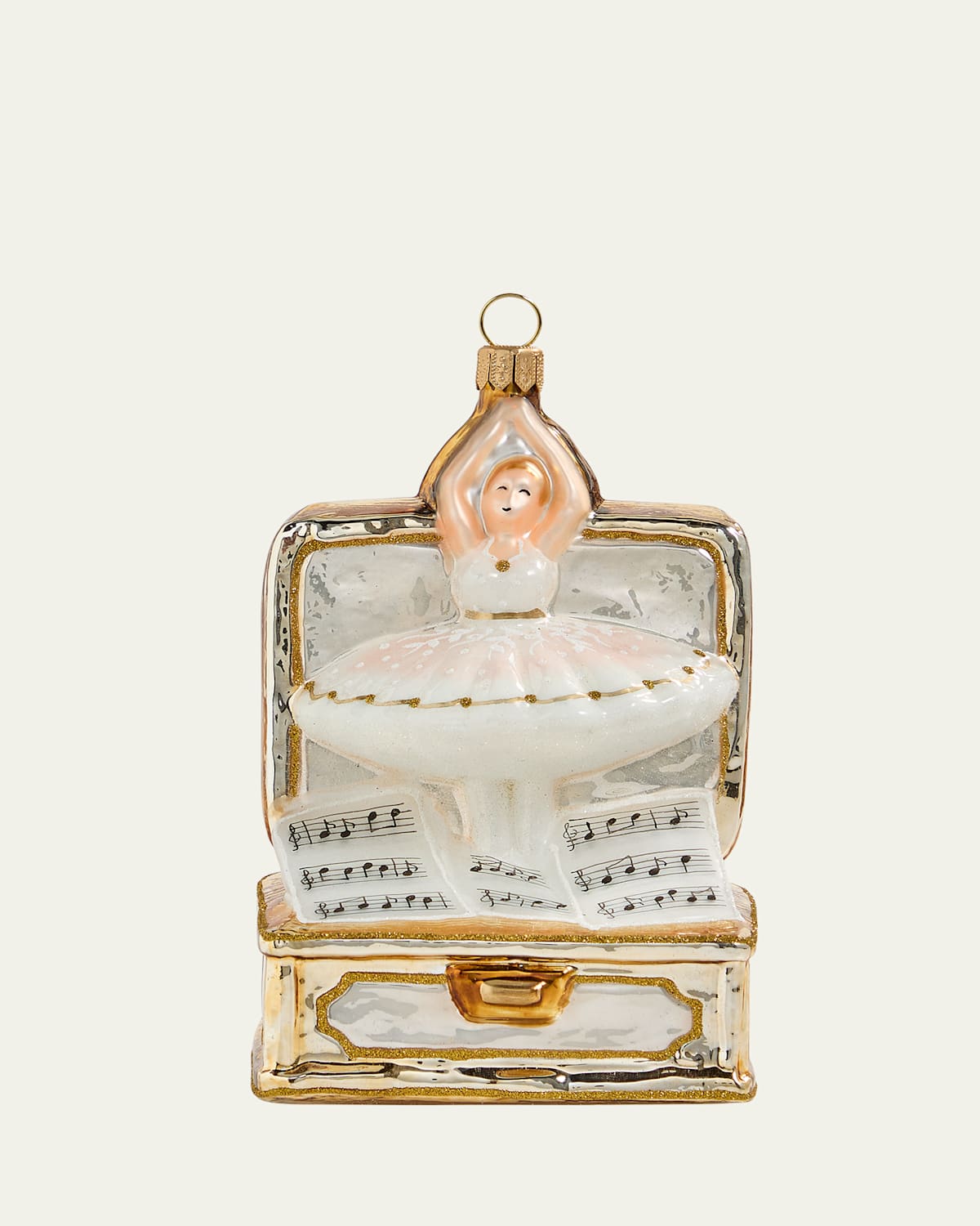 A smiling ballerina stands front and center for this handcrafted ornament. The Christmas ornament resembles an open box with music notes and a ballerina dressed in a full tutu. Handcrafted of glass Approx. 2.95"L x 3.0"W x 4.9"H Item Weight (Lbs.): 0.1 Handle with care Wipe clean Made in Poland