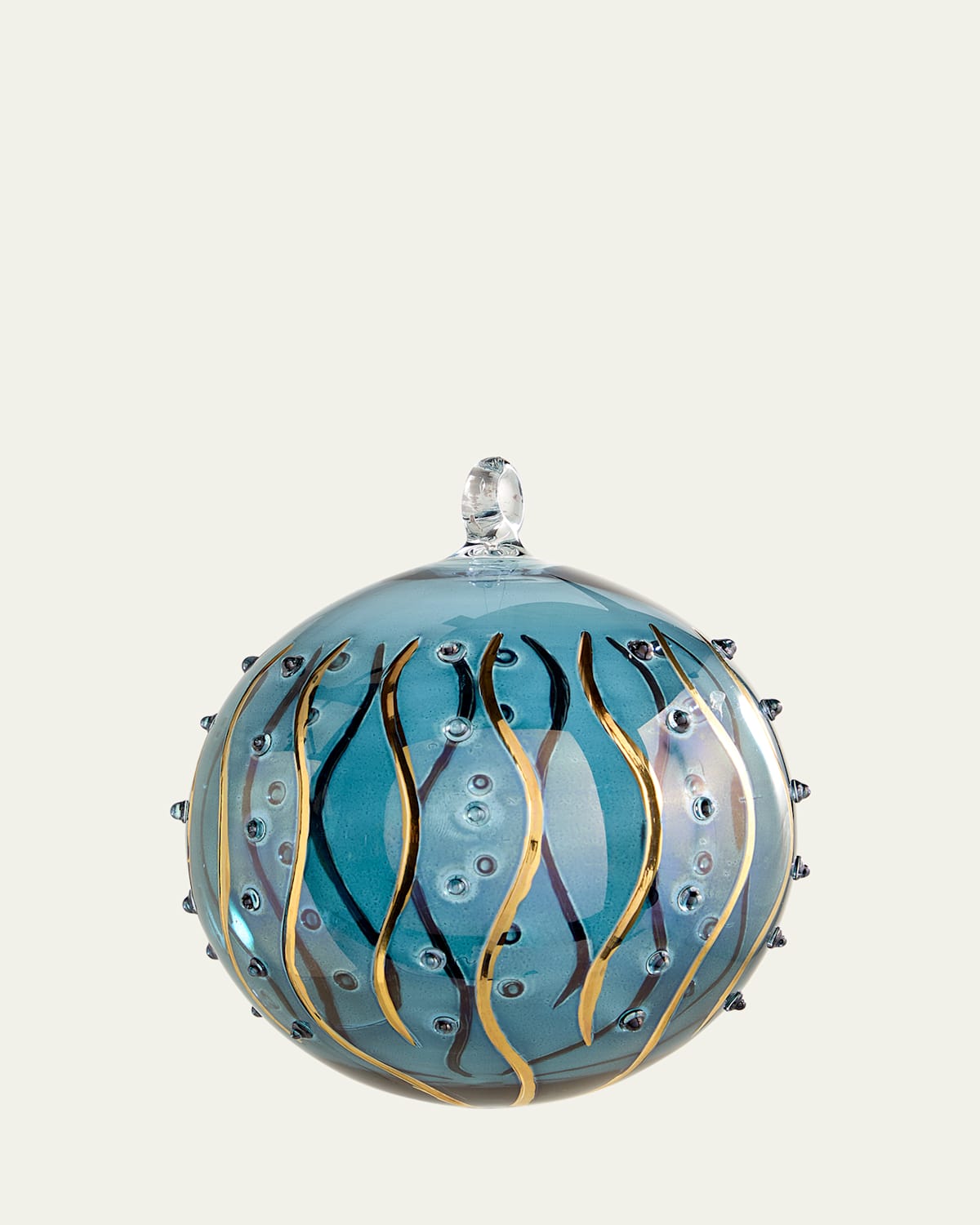 Ball ornament in a blue wave design Handcrafted of borosilicate glass Approx. 4"Dia. x 4.8"T Item Weight (Lbs.): 0.2 Imported