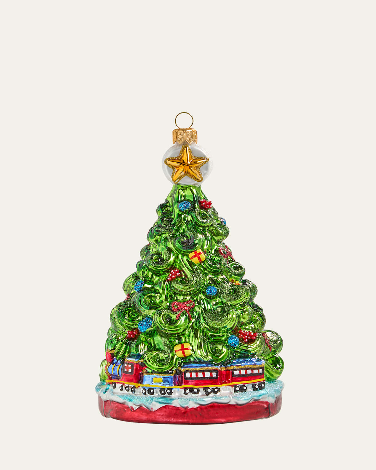 Toy trains surrounding the Christmas tree are a holiday tradition. This handmade Christmas tree ornament depicts the fun tradition with glitter trimmings. Handcrafted of glass Approx. 3.94"L x 3.9"W x 6.5"H Item Weight (Lbs.): 0.2 Handle with care Wipe clean Made in Poland