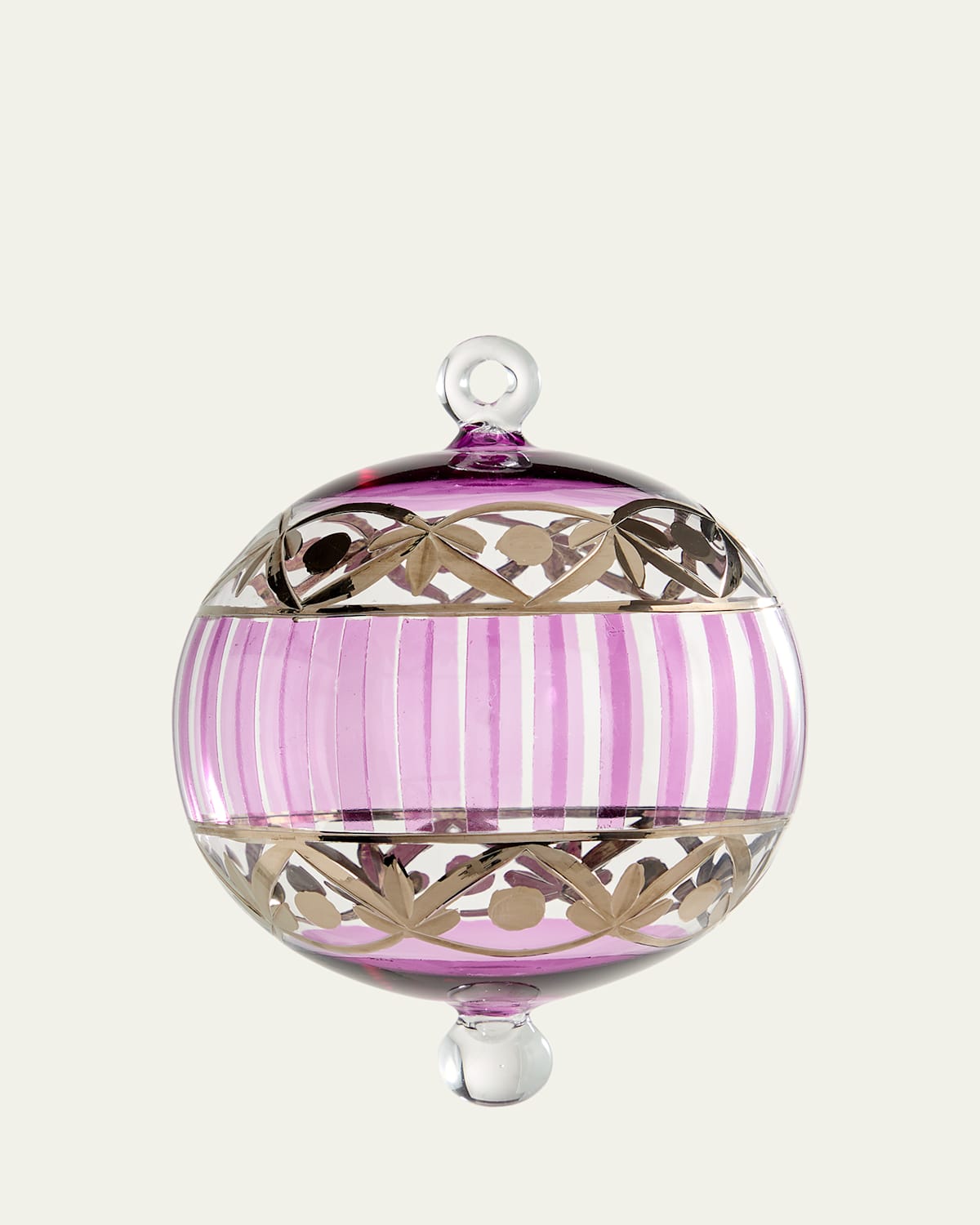 Clear ball ornament featuring a purple striped design Handcrafted of borosilicate glass Approx. 4"Dia. x 5.4"T Item Weight (Lbs.): 0.2 Imported