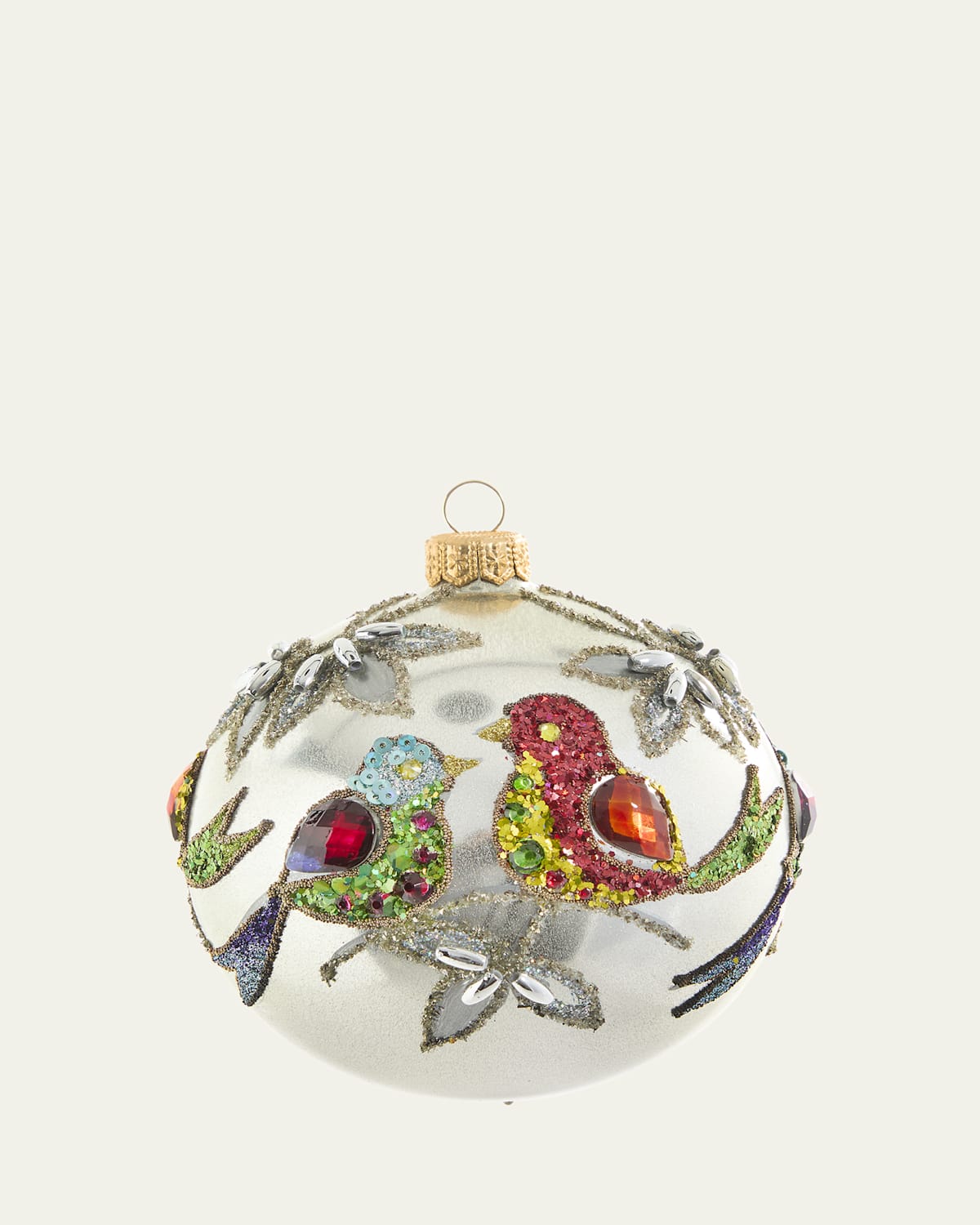 The perfect gift for any aviary enthusiast's Christmas tree, this silver ball ornament is decorated with glitter and sequin birds finished with flatback gemstone wings. Handpainted, glittery leaves with bead centers fill in the space around the birds for an allover work of art. Handcrafted of blown glass Brass ornament cap Approx. 4"Dia. x 4.4"T Item Weight (Lbs.): 0.7 Dust with a soft cloth Handle with care Made in Poland