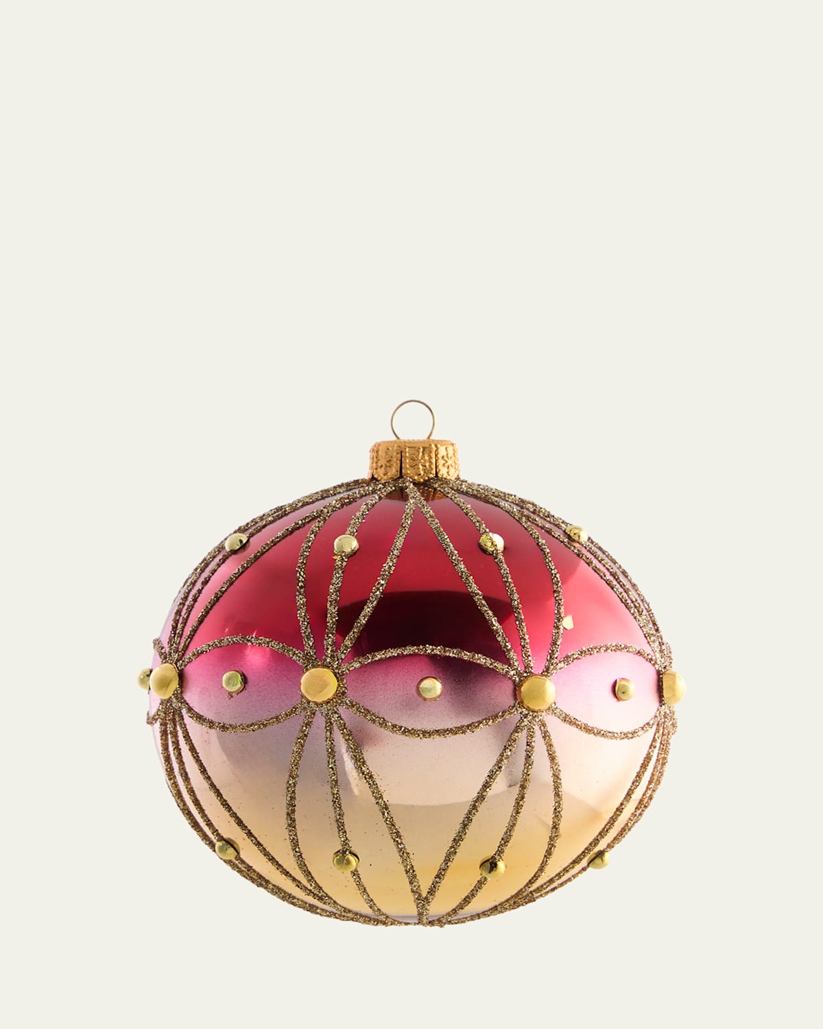 Add a touch of classic Christmas elegance to your tree with this ombre ball ornament that transitions from red to light pink to gold, handdecorated with gold glitter and flatback faux pearls in an Art Decoinspired design. Handcrafted of blown glass Brass ornament cap Approx. 4"Dia. x 4"T Item Weight (Lbs.): 0.1 Dust with a soft cloth Handle with care Made in Poland