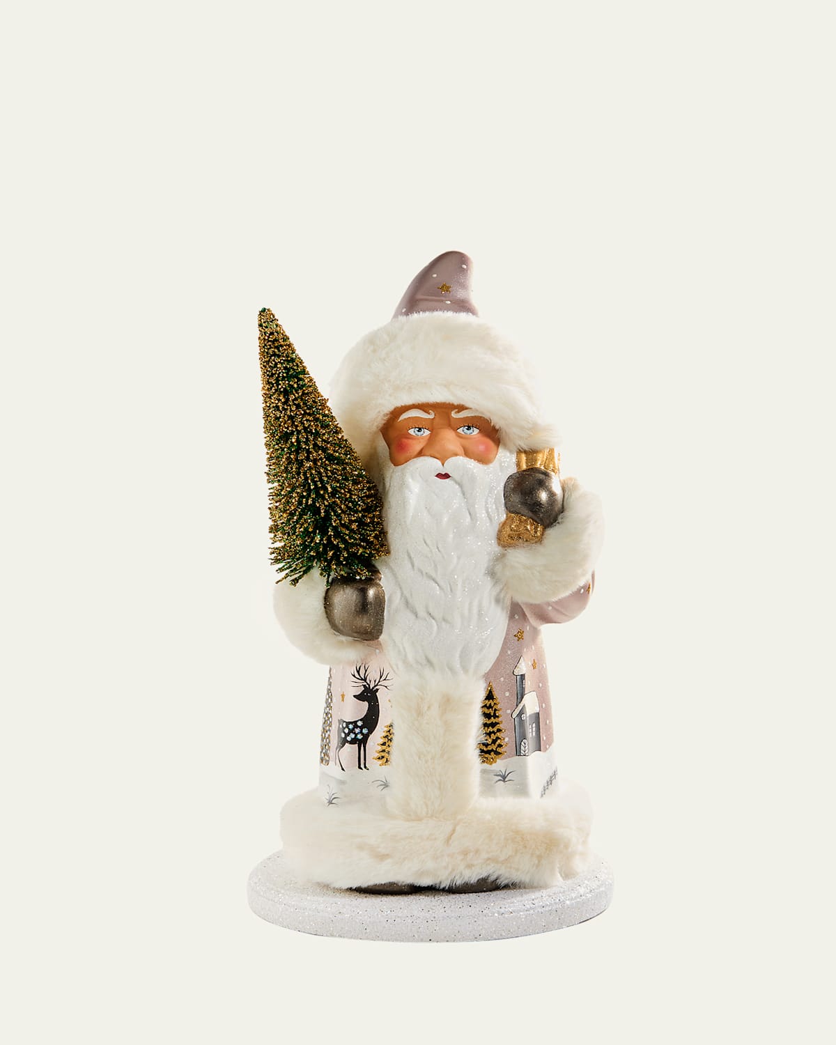 Handpainted with intricate attention to detail and embellished with glitter, this Santa figurine features a winter scene on the coat and is holding a bottle brush tree and a gift sack. Handcrafted of paper mache and faux fur (polyester) using old German traditions Approx. 8.85"Dia. x 16.9"T Item Weight (Lbs.): 4.8 Dust with a soft cloth Made in Germany