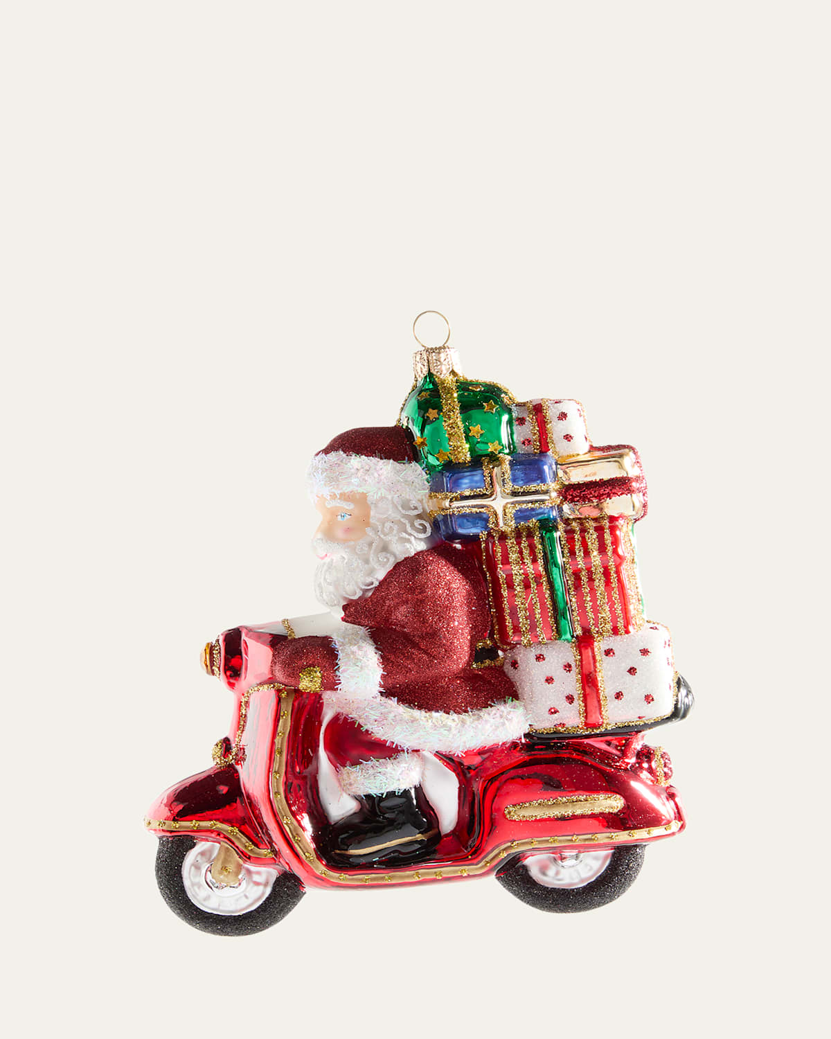 Santa Claus on scooter ornament handcrafted of soda glass, borosilicate glass, and glitter Approx. 2.1"L x 4.3"W x 4.9"T Item Weight (Lbs.): 0.2 Made in Poland