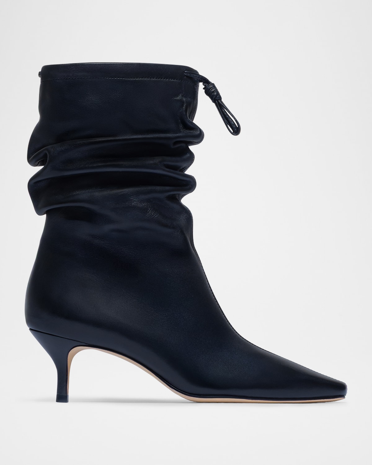 The "Mazzi" leather ankle boots by Bernardo are a masterclass in modern femininity. Designed on a delicate kitten heel, with a softly ruched shaft and drawstring detail, this bootie's silhouette flatters the leg with subtle drama and a touch of Parisian grunge. 3.25 in / 85 mm kitten heel Boot shaft, approx. 9"H Pointed toe Adjustable drawcord collar Pullon style Leather insole and outsole Made in Brazil